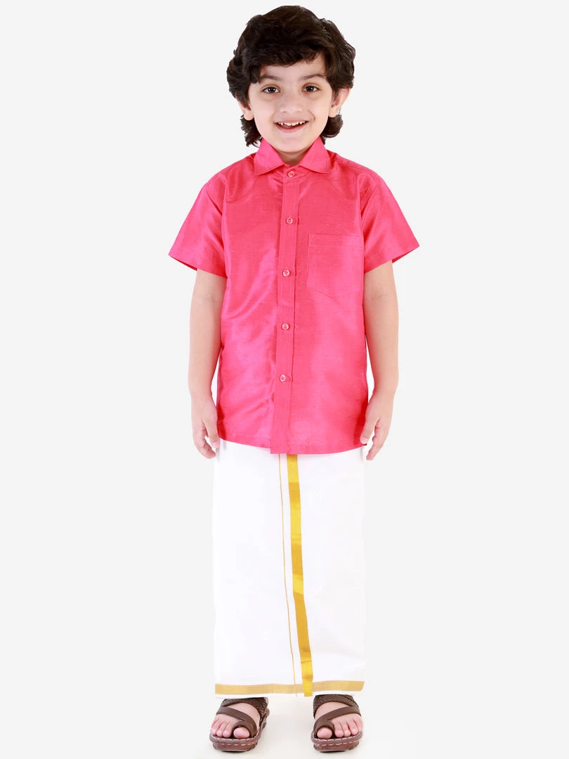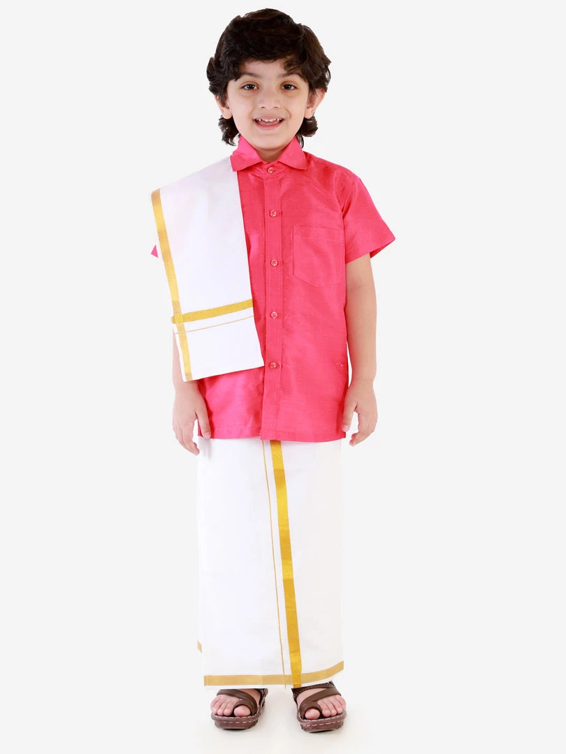 This clothing set consists of shirt, mundu vesty style dhoti pants and dupatta