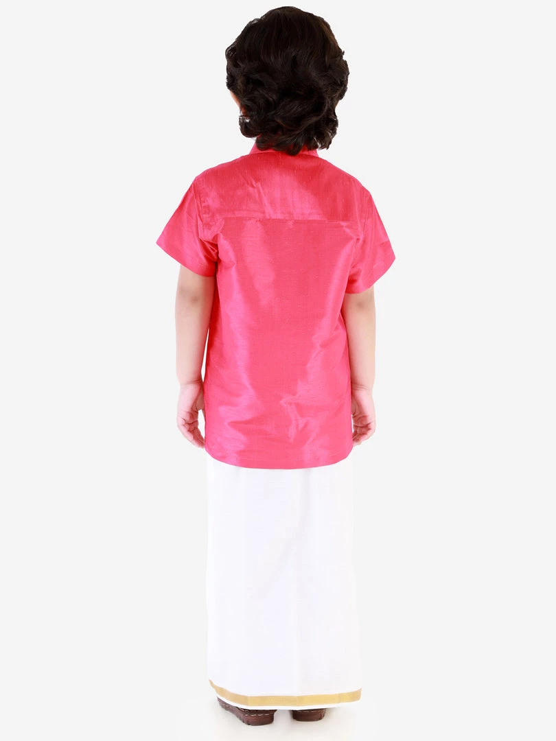 Punch pink textured ethnic casual shirt, has a shirt collar, short sleeves, full button placket, straight hem, and one patch pocket. A white solid dupatta with woven golden border