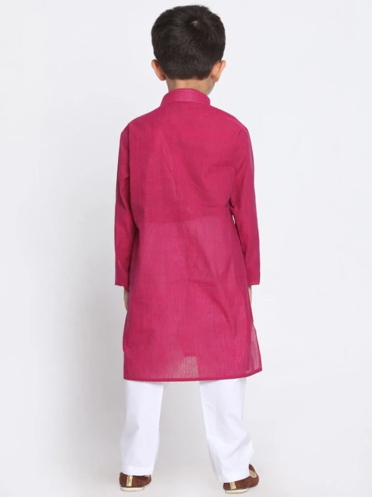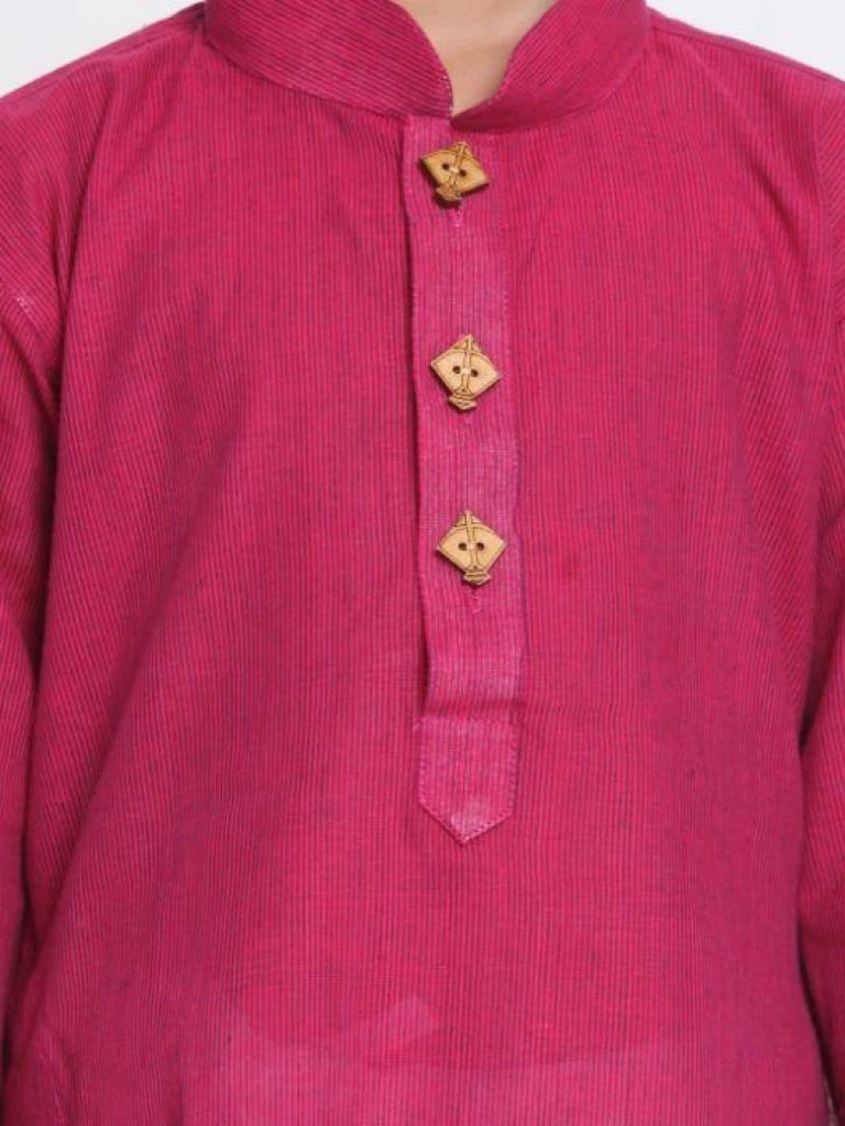 Purple straight woven stripe knee length kurta, has a mandarin collar, long sleeves, straight hem, placket with kite shape wooden button, side slits