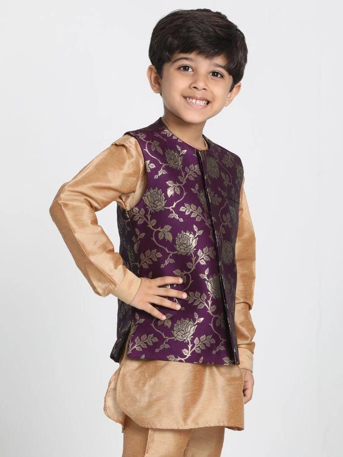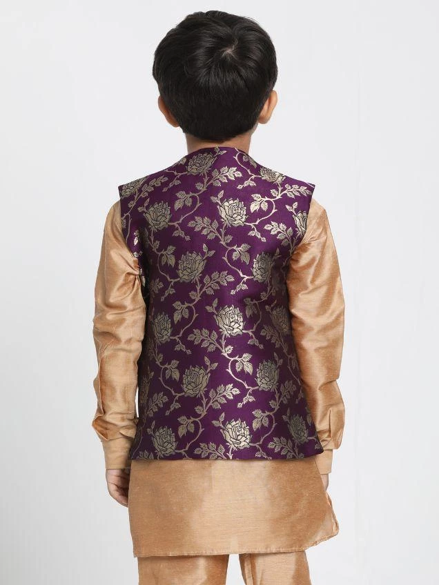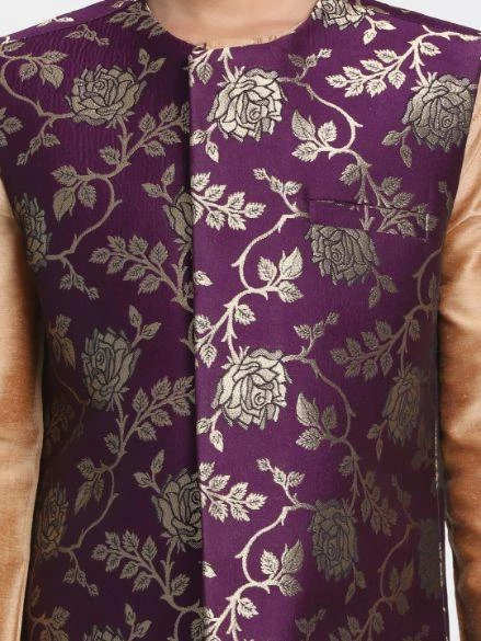 Purple and gold Woven Nehru jacket, has a round neck, a full button placket, sleeveless, straight hem, and one pocket.