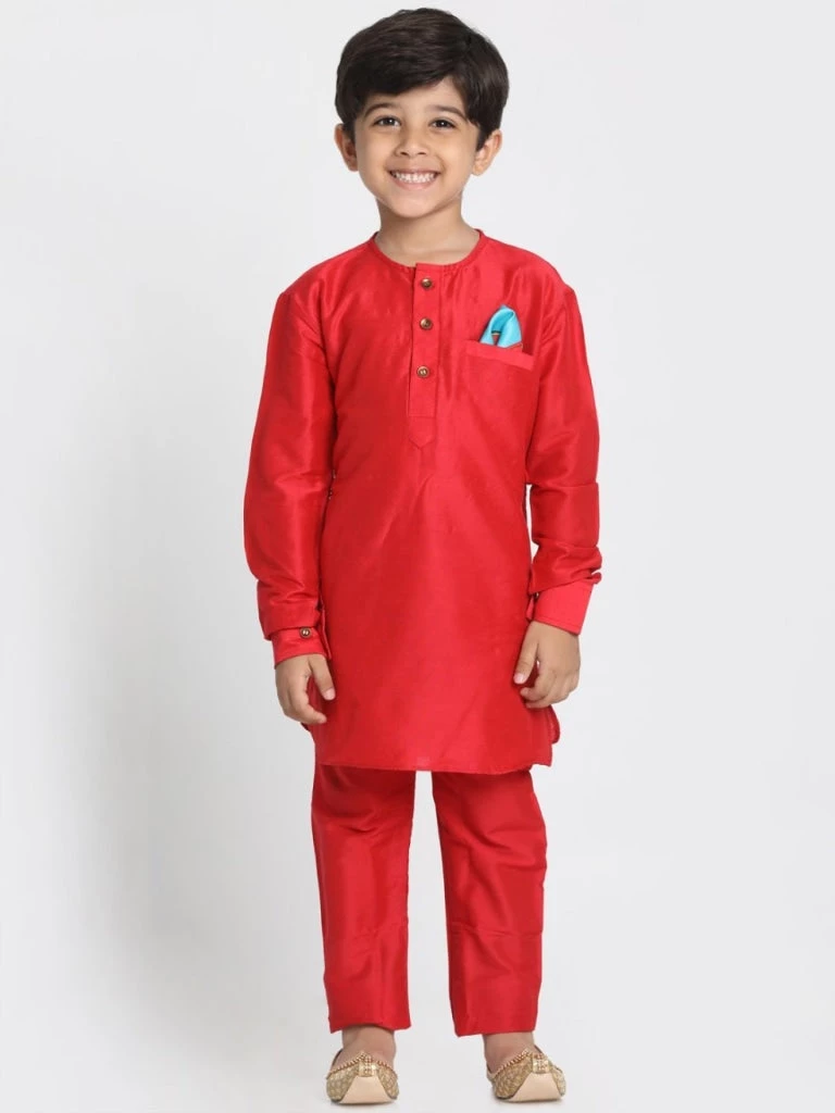 Red solid kurta, full sleeves, has a mandarin collar, knee-length, straight hemline, side-slits, and one pocket with a pocket square.