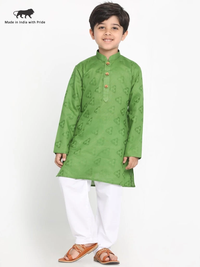 Green straight knee length Woven self design kurta, has a mandarin collar, long sleeves, placket with wooden button, straight hem