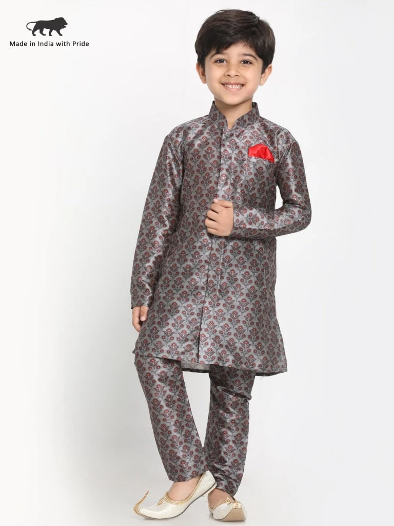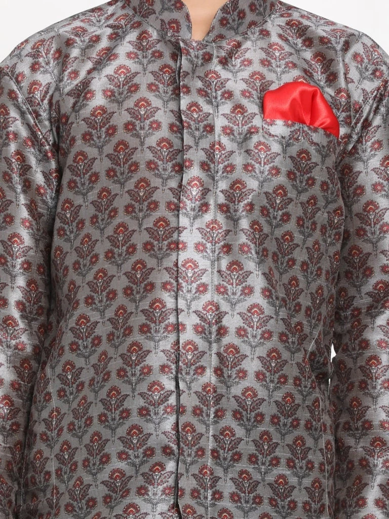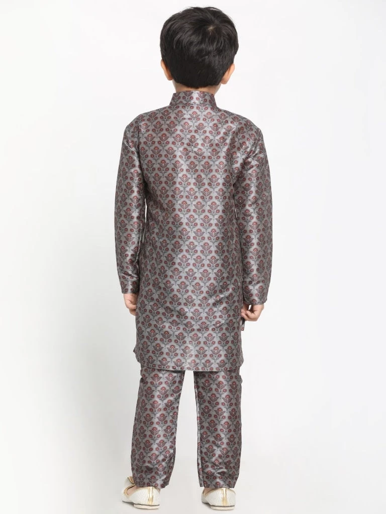Grey and maroon straight knee length printed kurta, has a mandarin collar, full invisible button placket, a welt pocket, long sleeves, straight hem