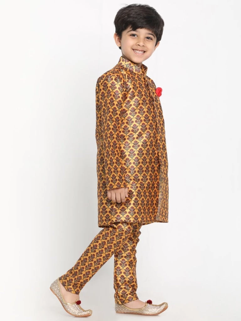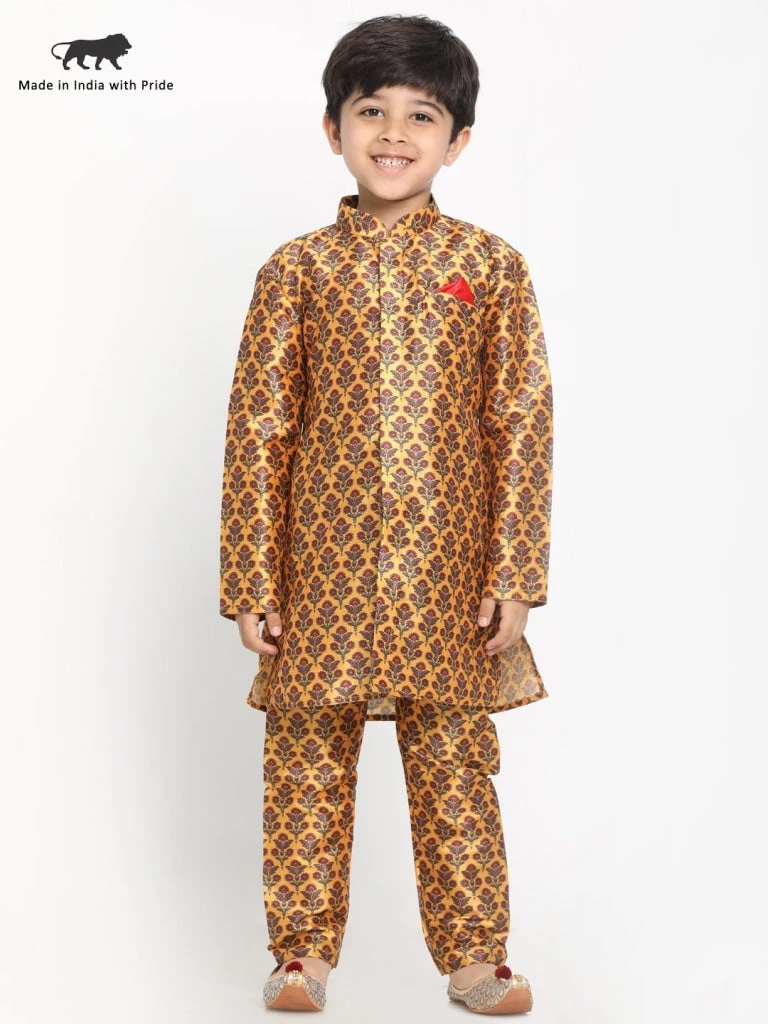 Yellow and multicolor straight knee length printed kurta, has a mandarin collar, full invisible button placket, a welt pocket, long sleeves, straight hem