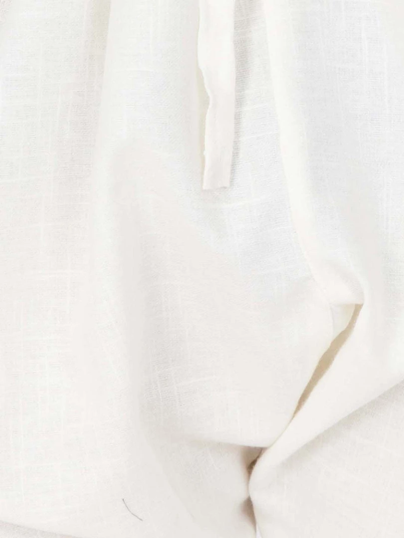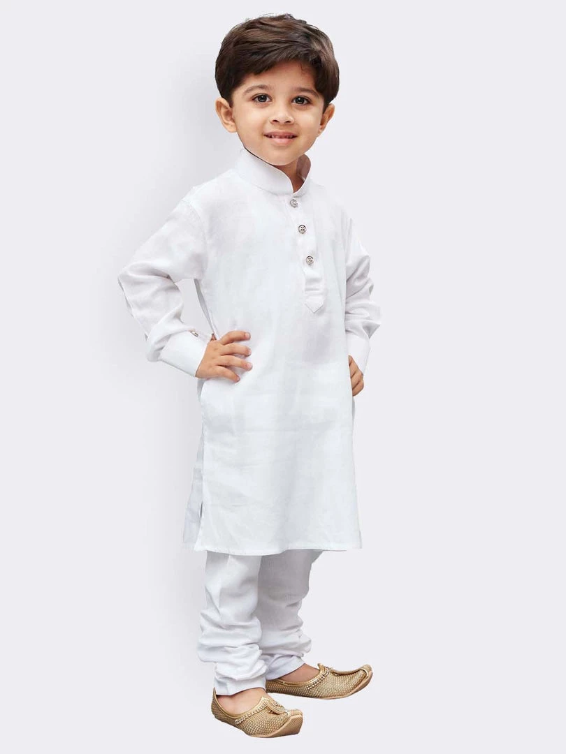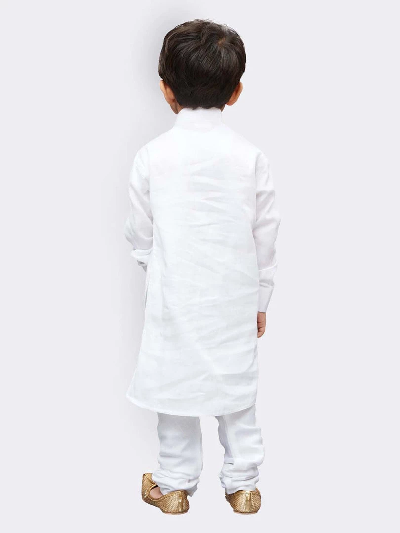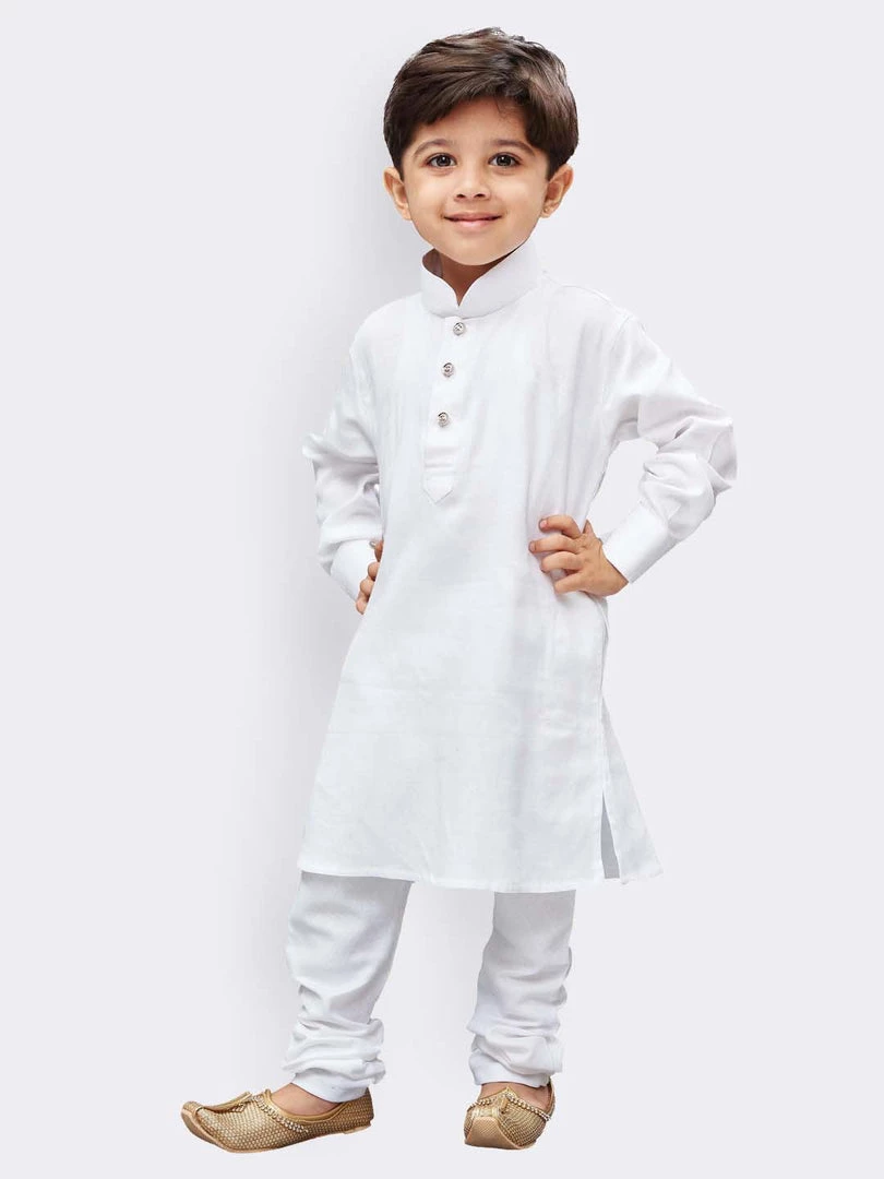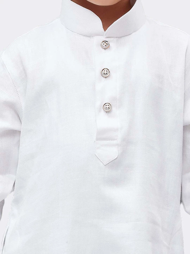 White straight knee length kurta, has a mandarin collar, long sleeves, button placket, straight hem, side slits