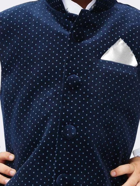 Navy blue and white polka dot printed jacket, has mandarin collar, welt pocket, button closure, sleeveless