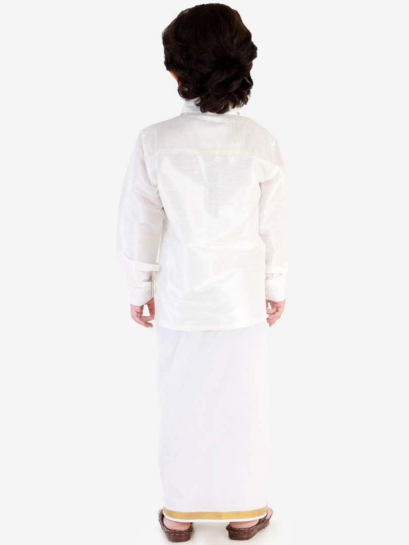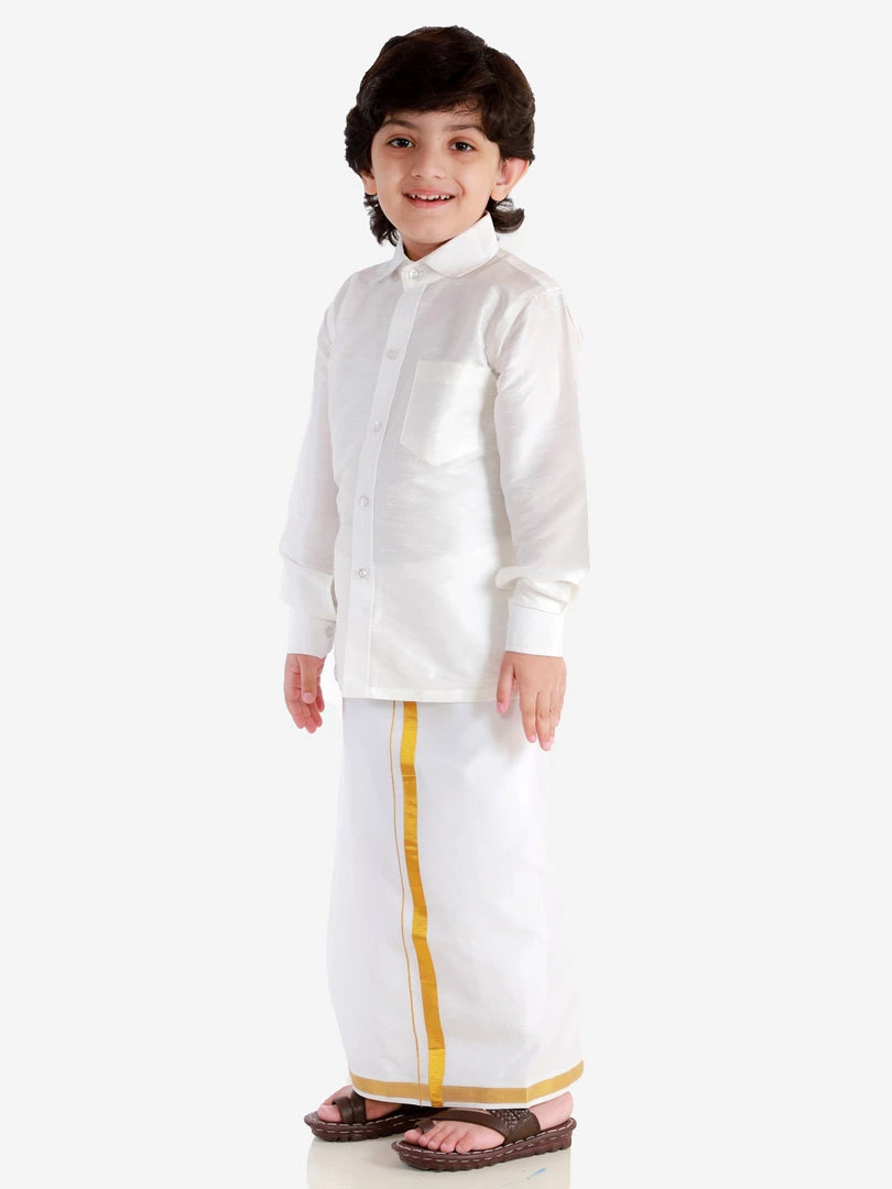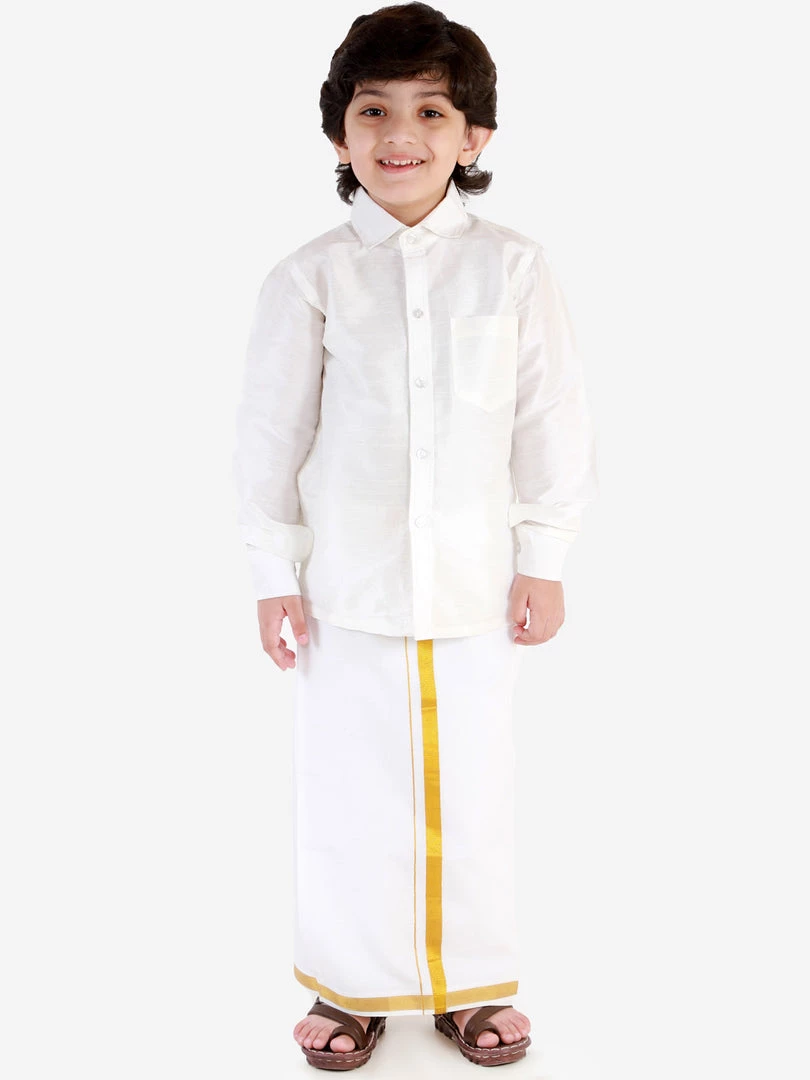This clothing set consists of shirt, veshti style dhoti and dupatta