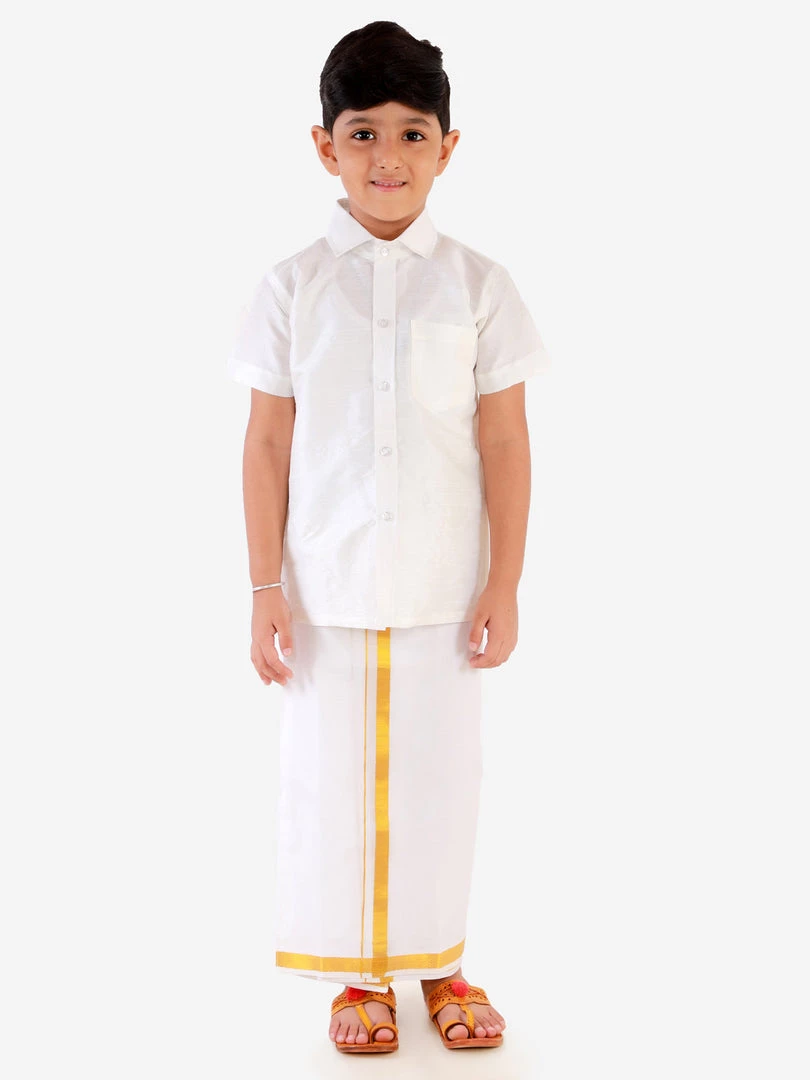 This clothing set consists of shirt, veshti style dhoti and dupatta