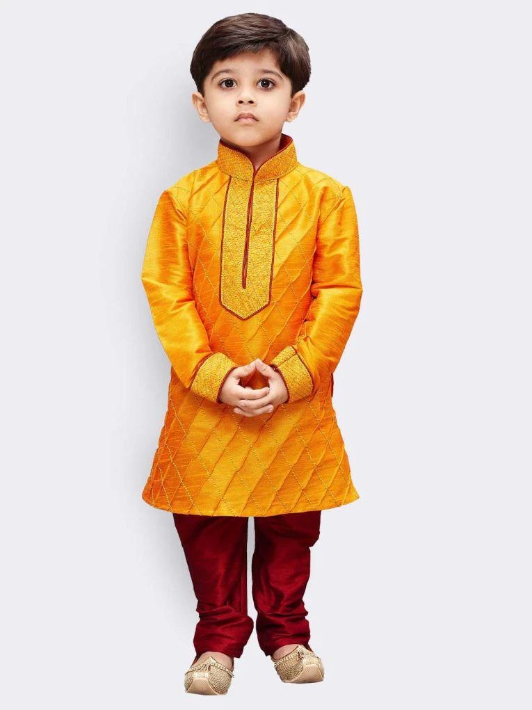 Maroon and yellow kurta with pajama, Yellow straight knee-length kurta, has a mandarin collar, long sleeves, straight hem, side slits