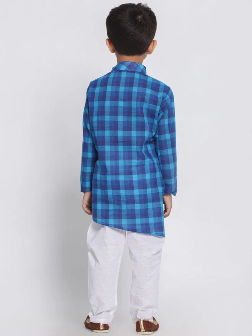 Blue checkered pattern woven straight knee length kurta, has a mandarin collar, long sleeves, asymmetrical hem, button placket and side slits