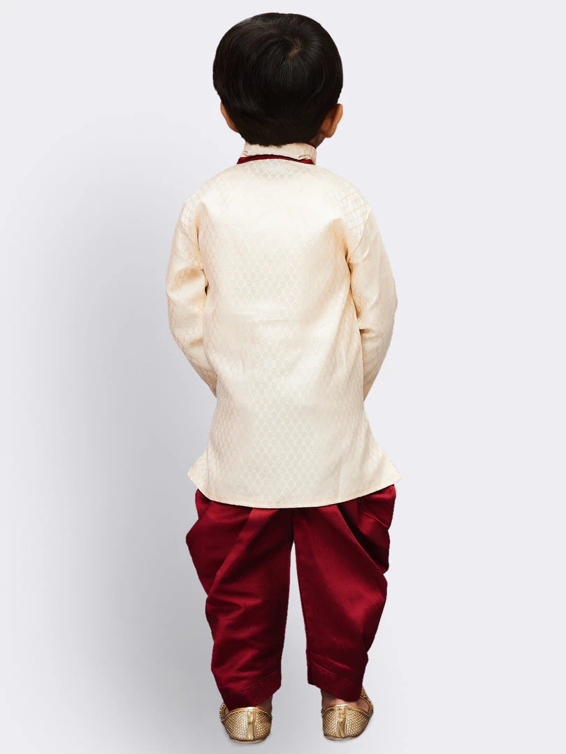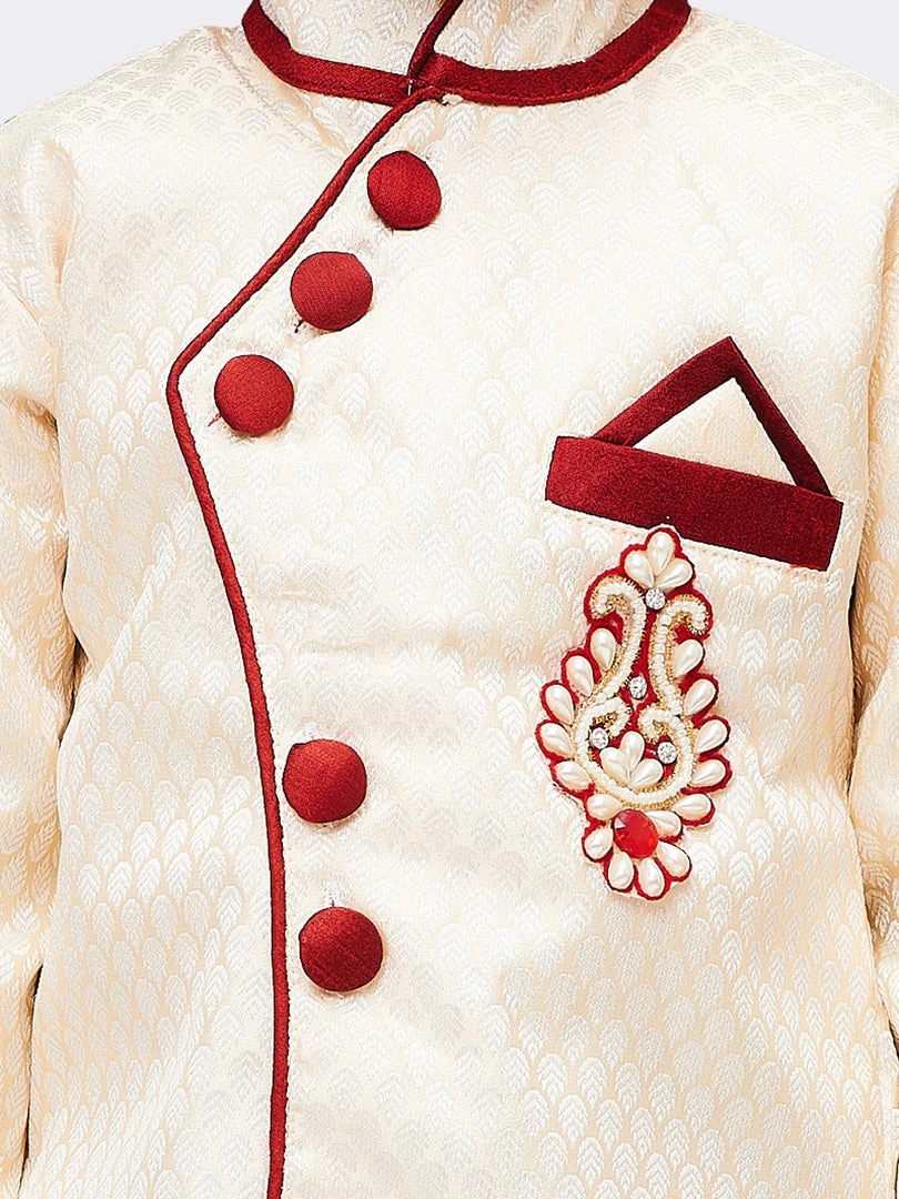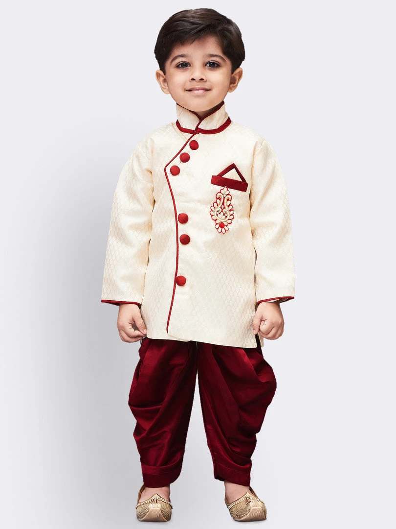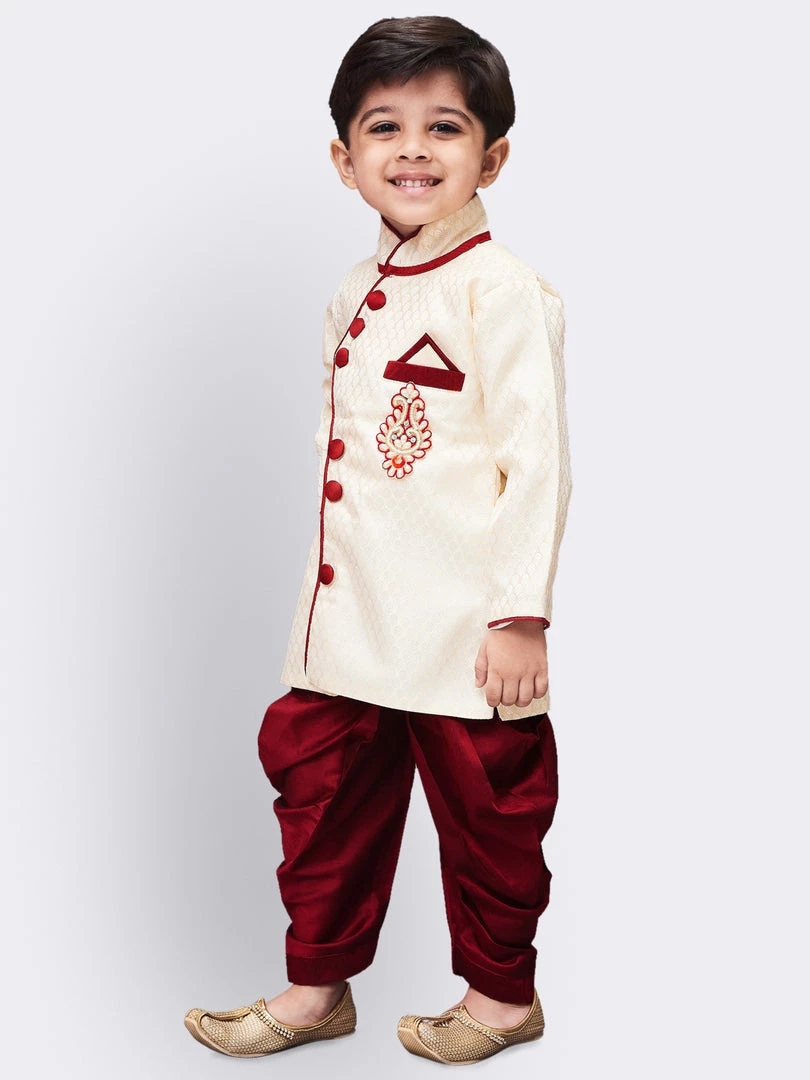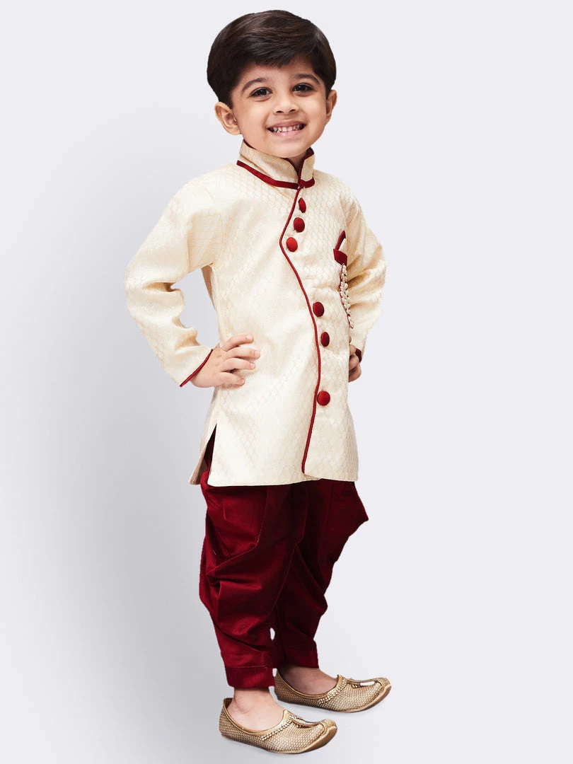 This sherwani set from Vastramay is a must have in your little boys ethnic collection wardrobe. Team is with a pair of mojaris for a cute ethnic look.