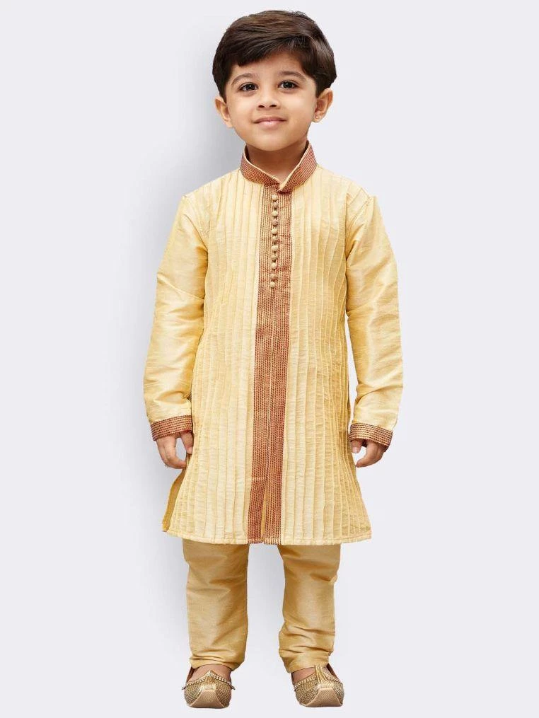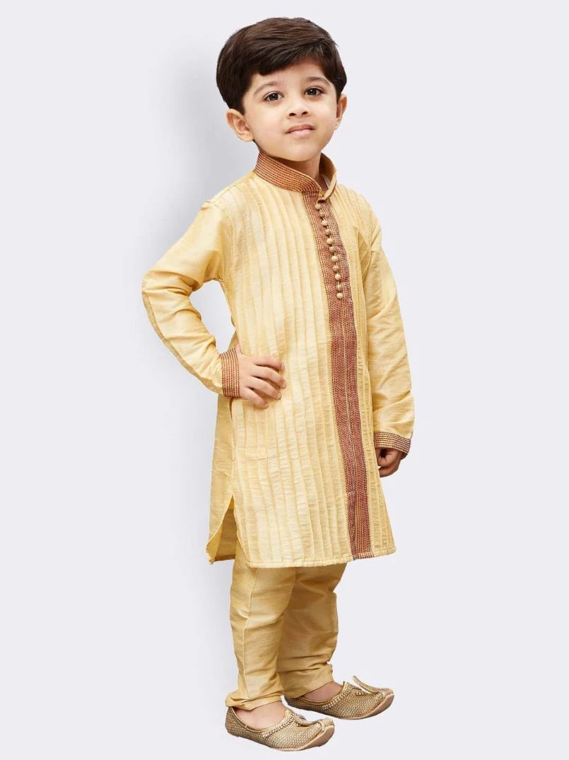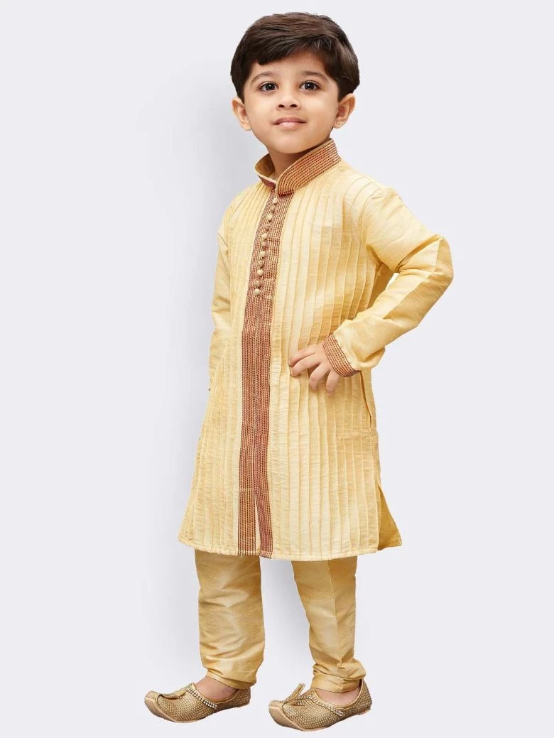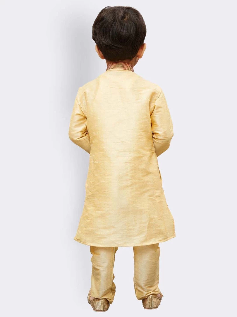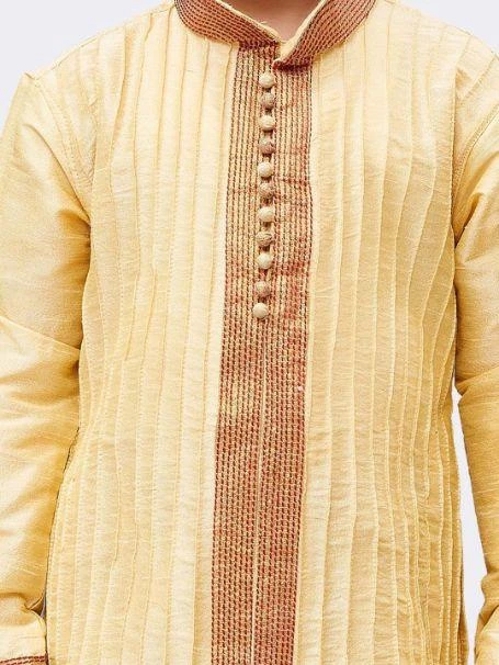 Golden solid kurta with pajama, Golden straight knee-length kurta, has a mandarin collar, long sleeves, straight hem, side slits