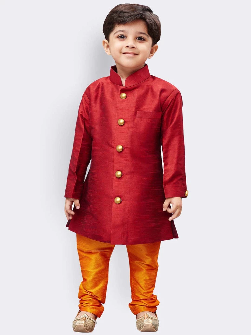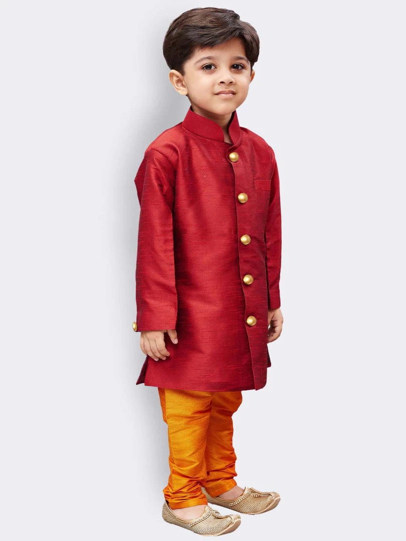 Maroon and Yellow kurta with pajama, Maroon straight knee-length kurta, has a mandarin collar, long sleeves, straight hem, side slits