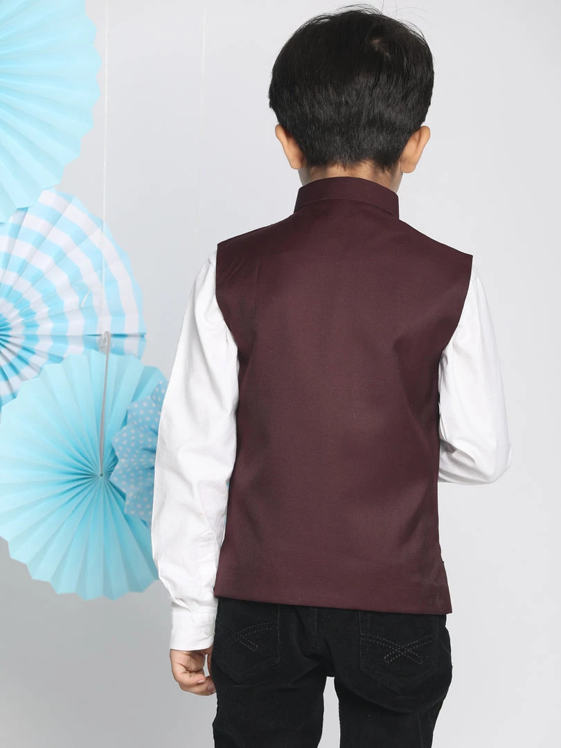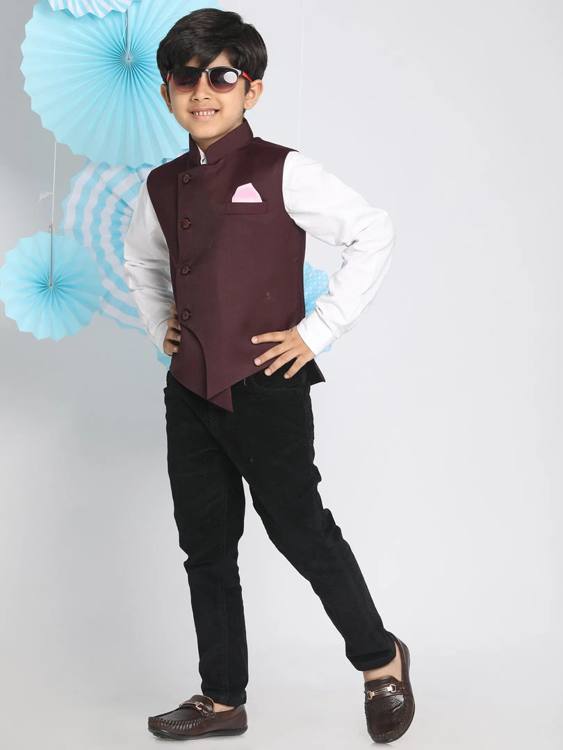 Maroon solid woven Nehru jacket, has a mandarin collar, a side button placket, sleeveless, and one pocket and asymmetric hem