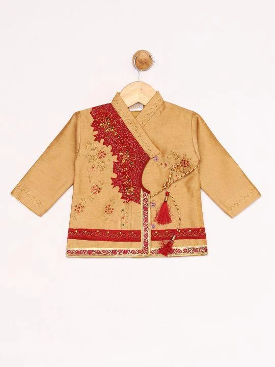 Rose Gold and maroon above knee length angrakha kurta, has a V-neck, long sleeves, side slits