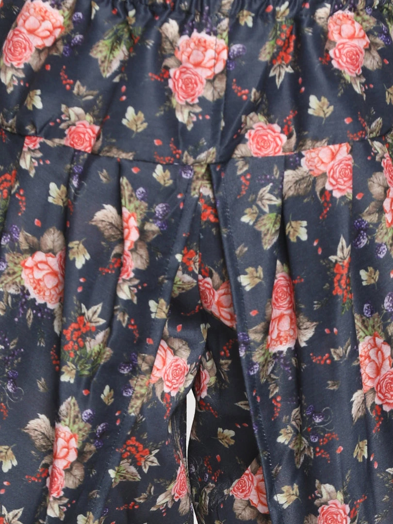 Dark blue base multicolor floral printed dhoti pants, has elasticated waistband