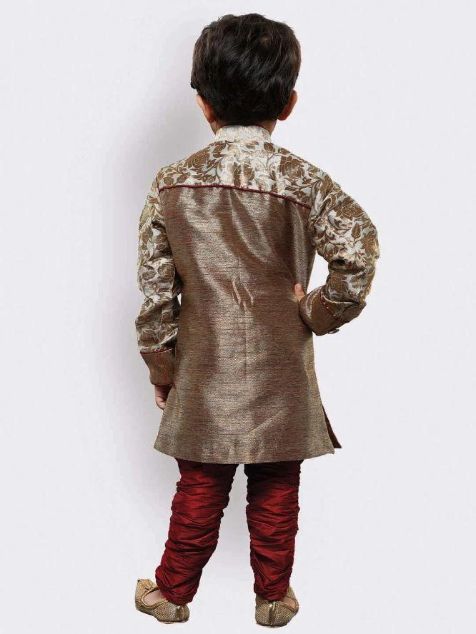 Bronze woven Sherwani, straight Knee-length, full sleeves, Straight hem, side slits, have a mandarin collar.