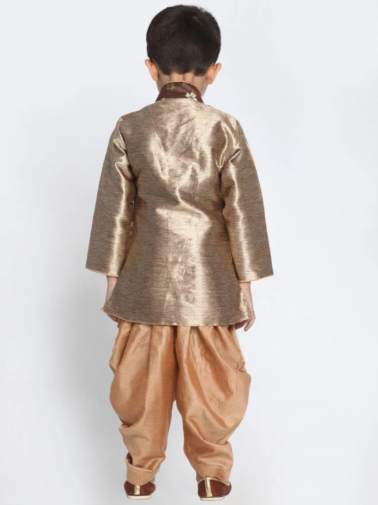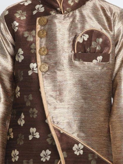 Copper-coloured, brown and gold-coloured floral woven design sherwani has a mandarin collar, full sleeves, a short button placket and a welt pocket