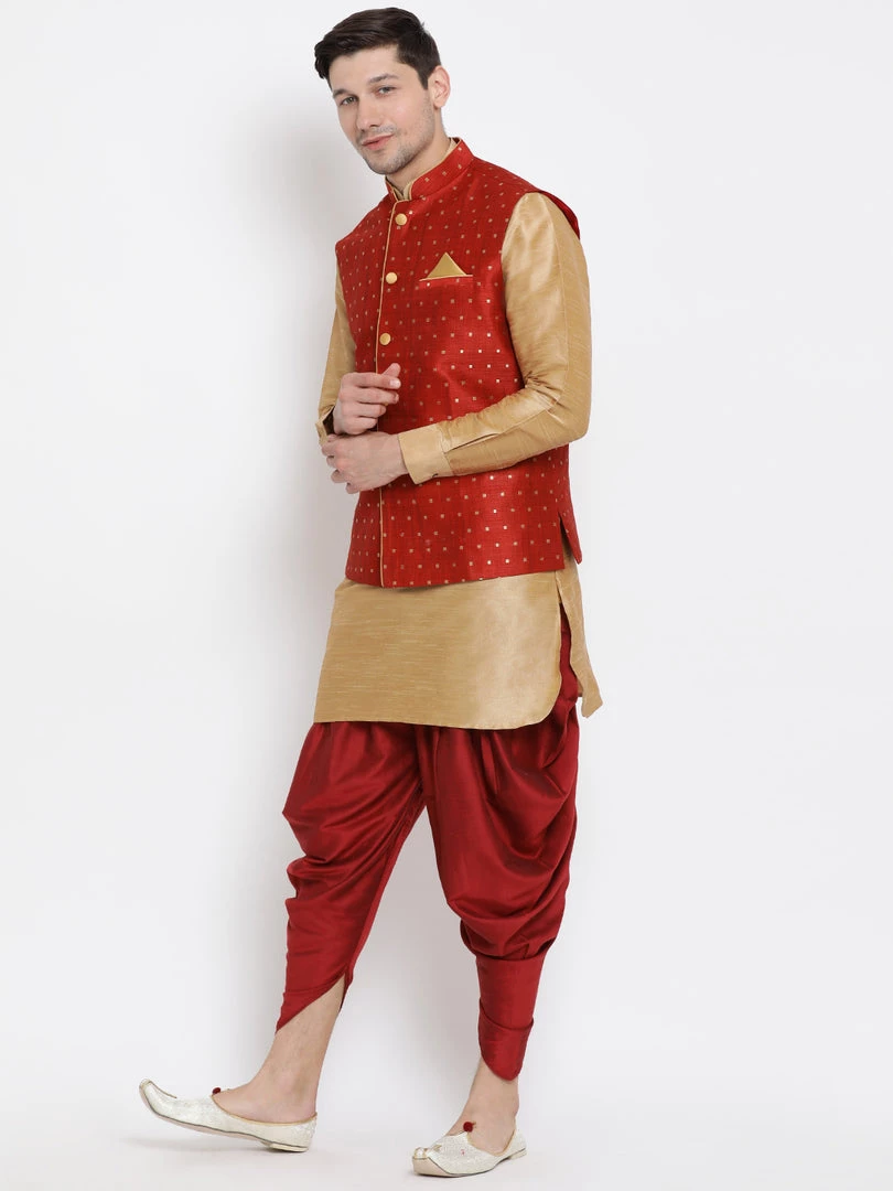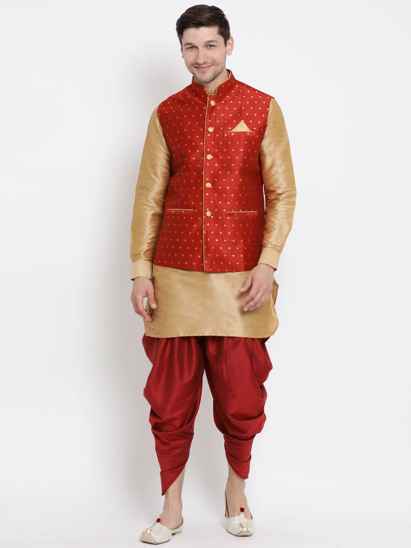 Maroon jacquard nehru jacket, sleeveless, has a mandarin collar, front button placket and welt pocket with pocket square.