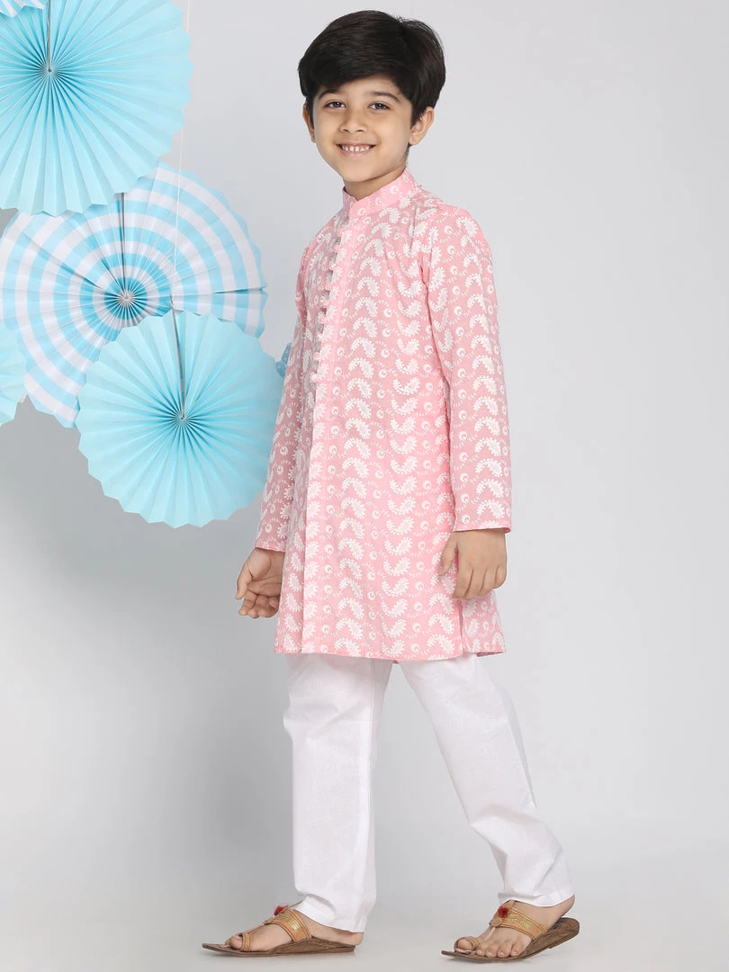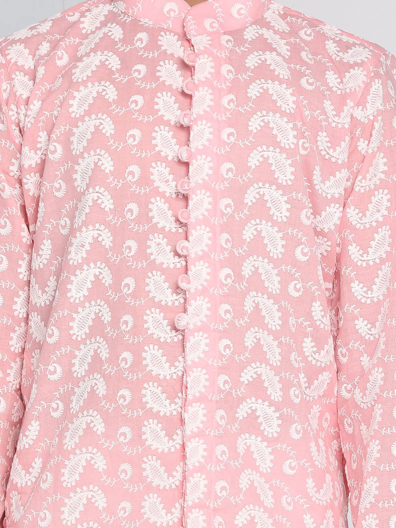 Pink and white straight embroidered knee-length kurta, has a mandarin collar, long sleeves, straight hem, button placket, side slits