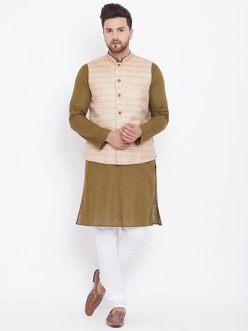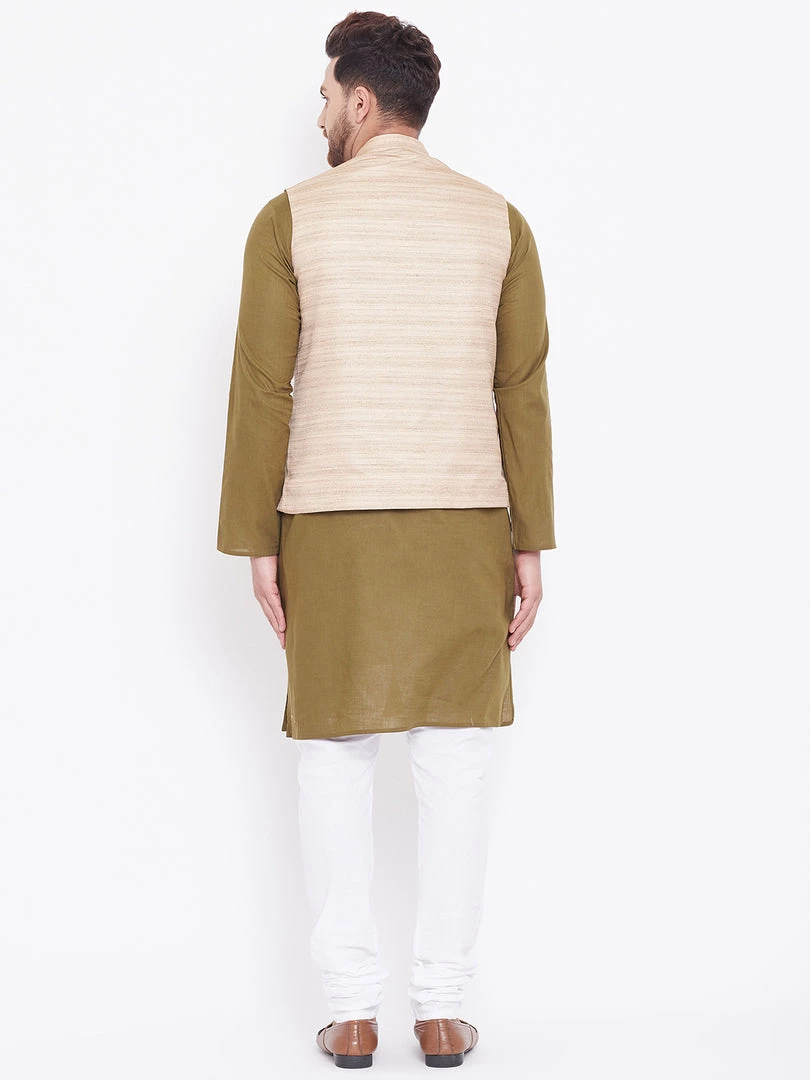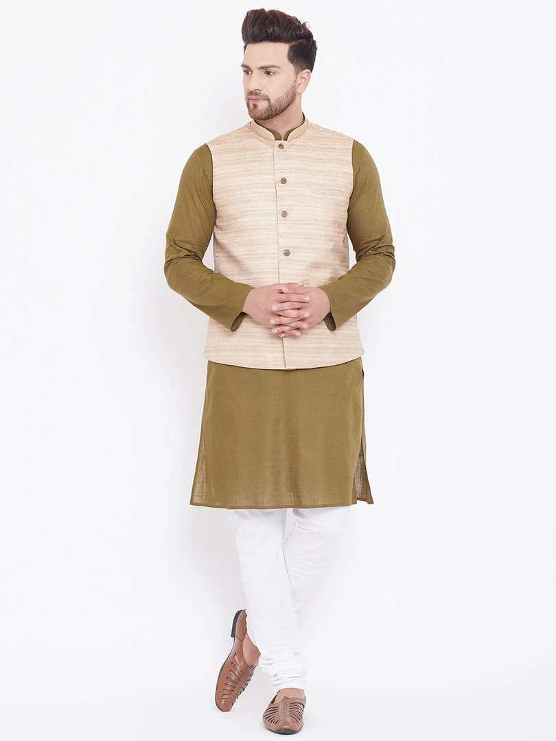 Mehndi green solid kurta with solid churidar and beige Nehru jacket