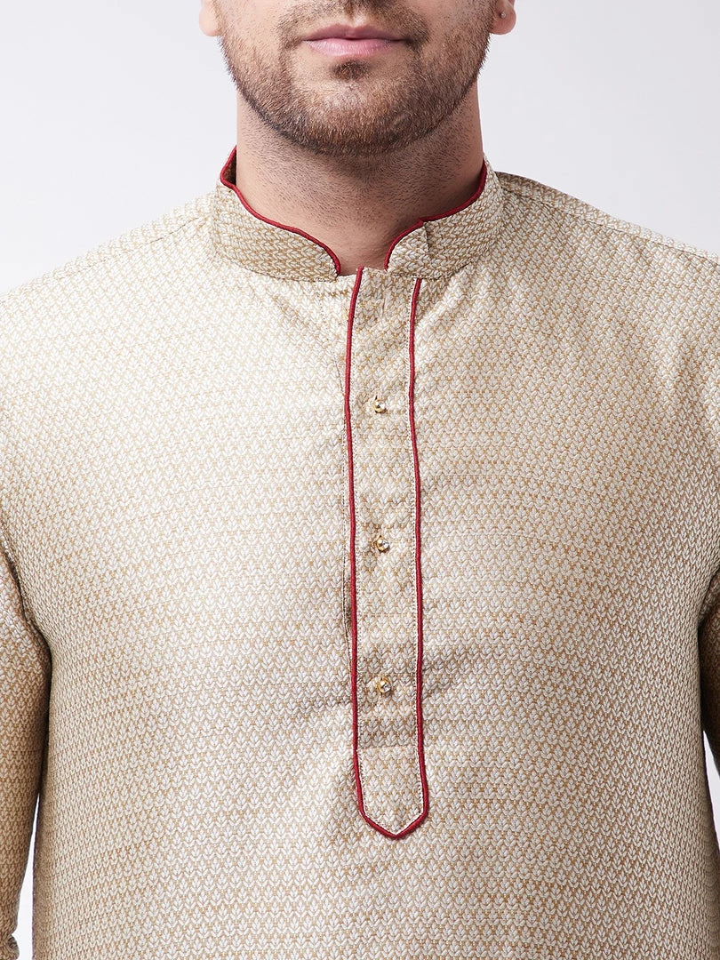 Beige woven design banarasi jacquard straight knee-length kurta, has a mandarin collar, maroon piping detailing, button placket, long sleeves, a straight hem, and side slits.