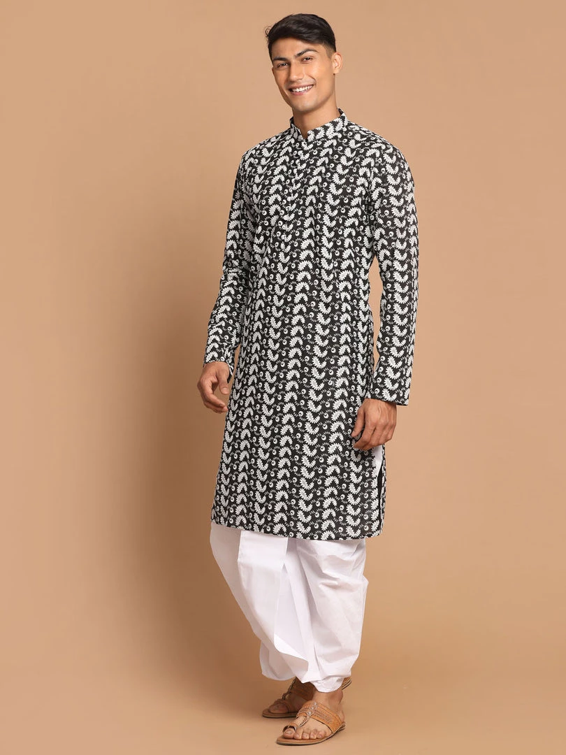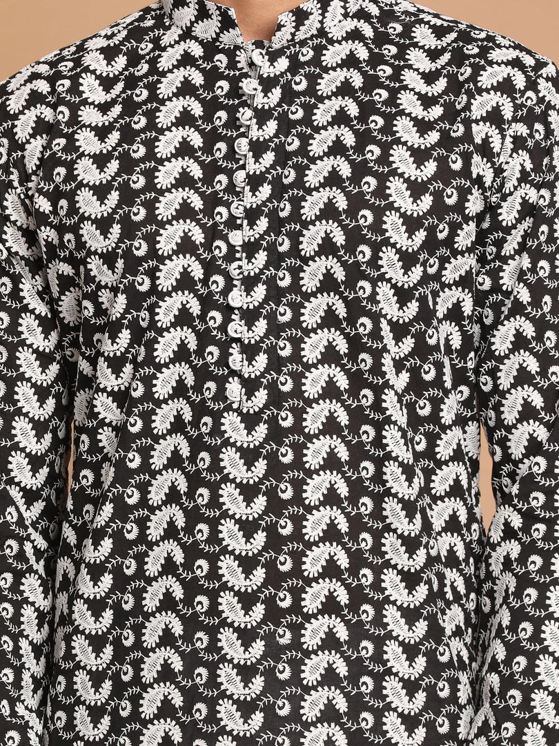 Black ethnic embridered cotton knee length kurta has mandarin collar,long – regular sleeves,straight shape with regular style