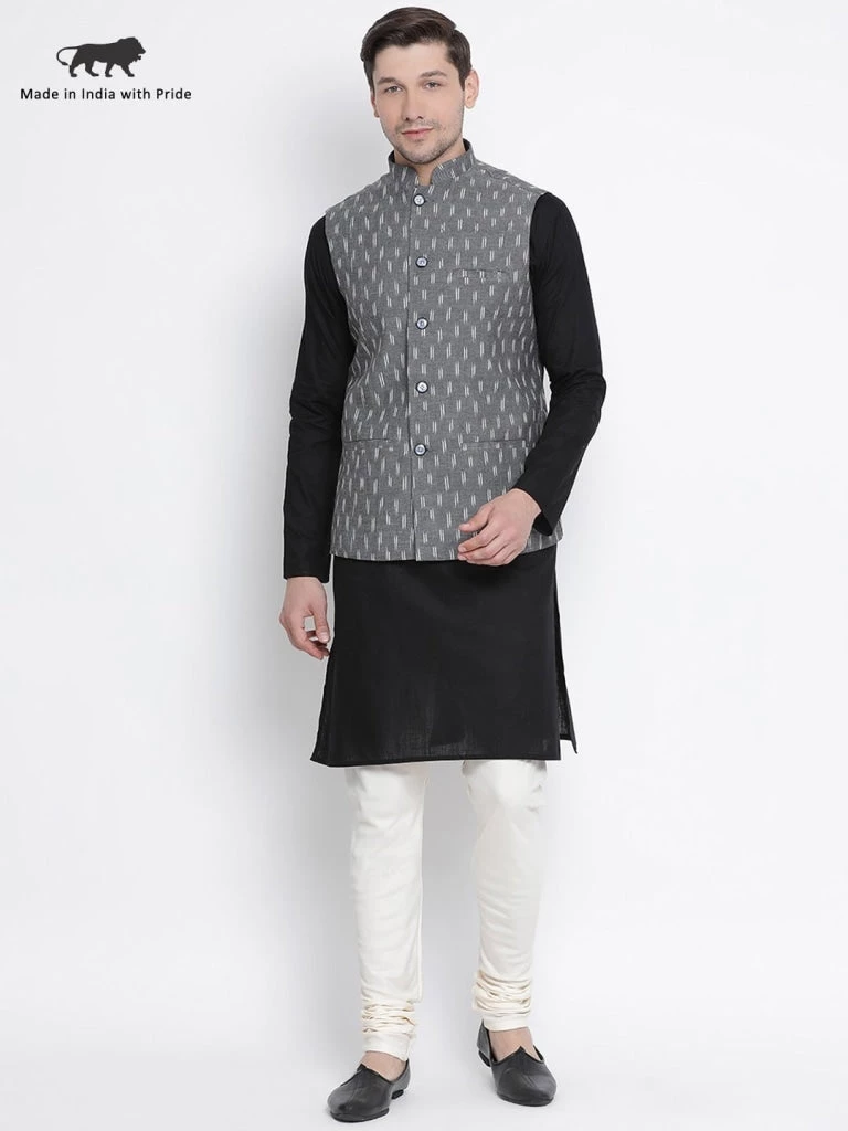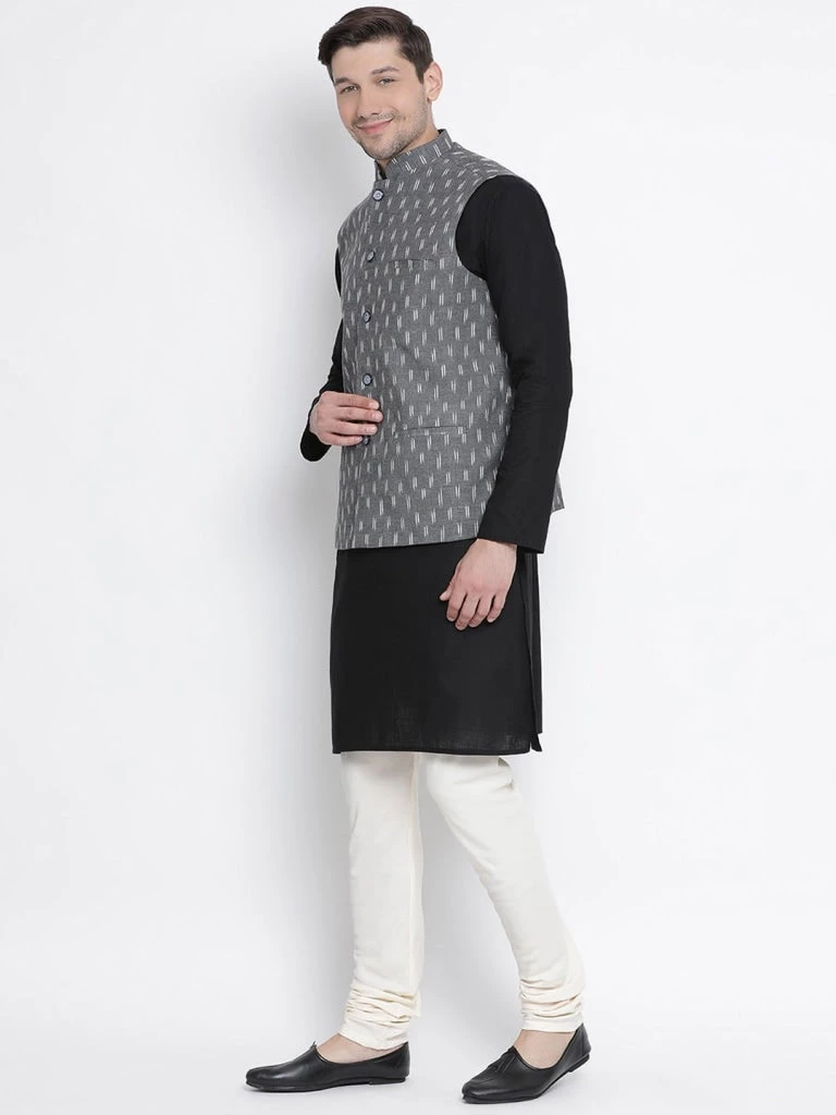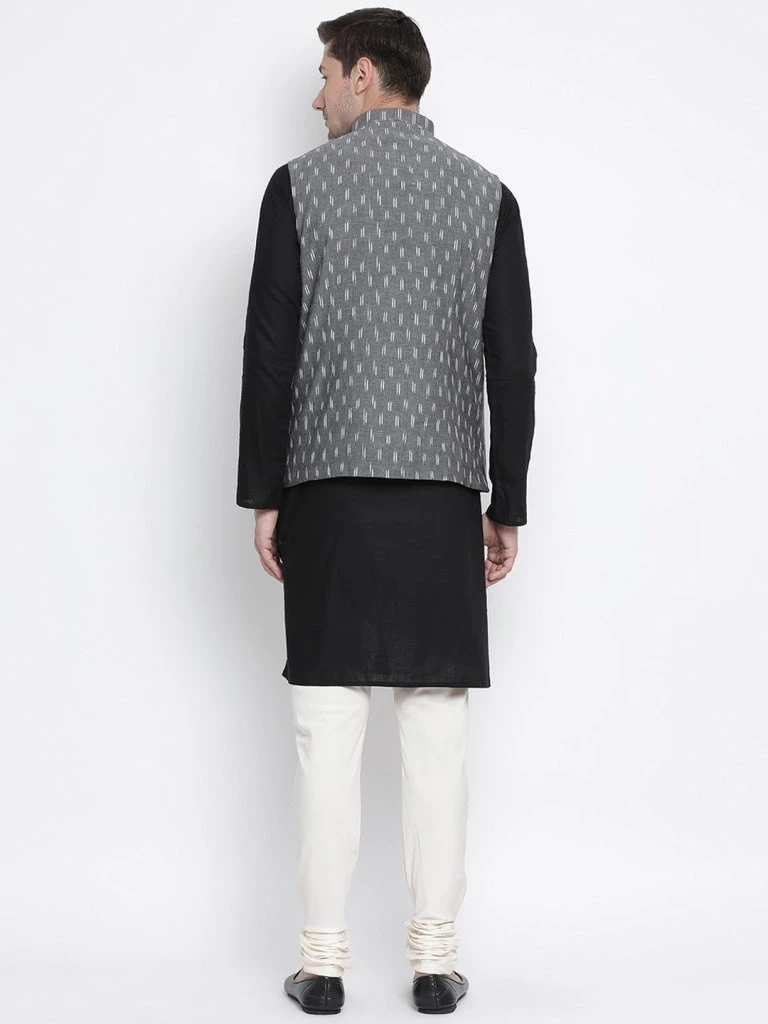 Black solid kurta with White solid churidar and grey Nehru jacket