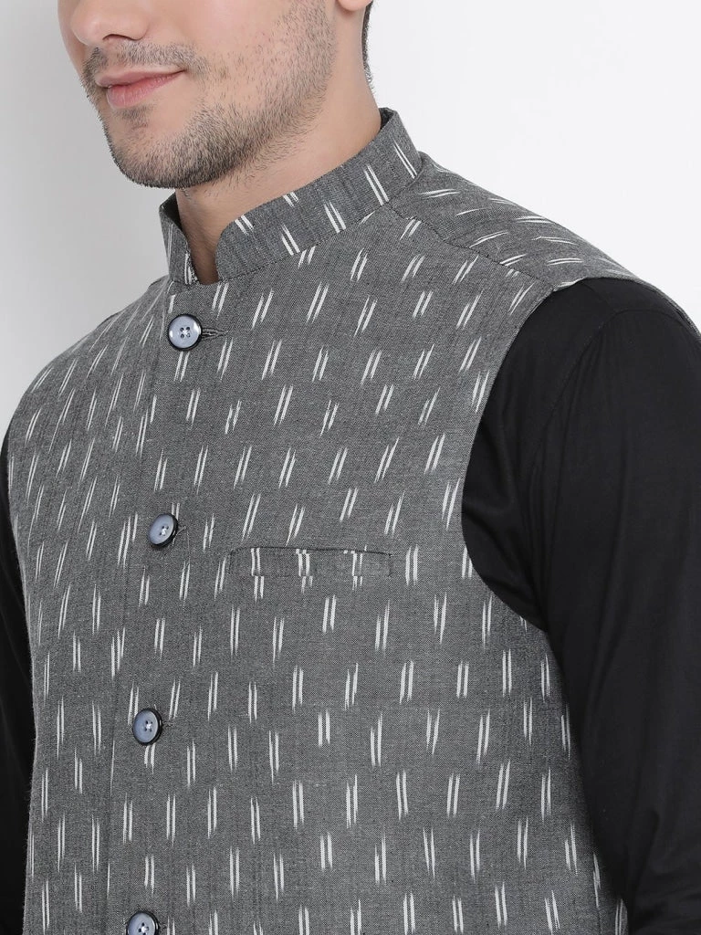 Grey woven Nehru jacket, has a mandarin collar, a full button placket, sleeveless, three welt pockets