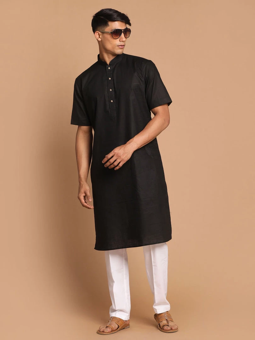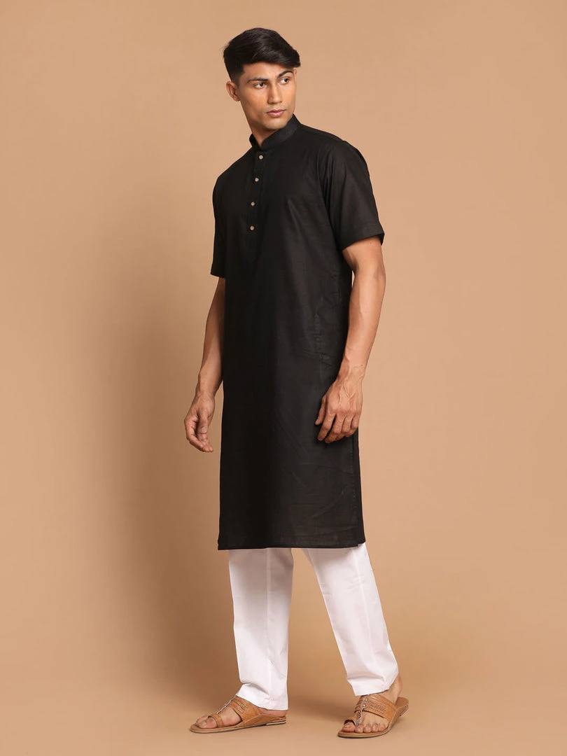 Black solid straight knee-length kurta, has a mandarin collar, short sleeves, button placket, straight hem, and side slits