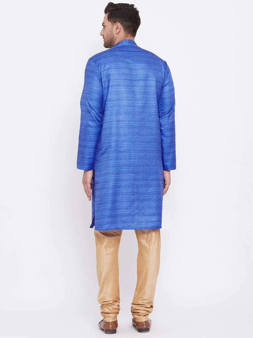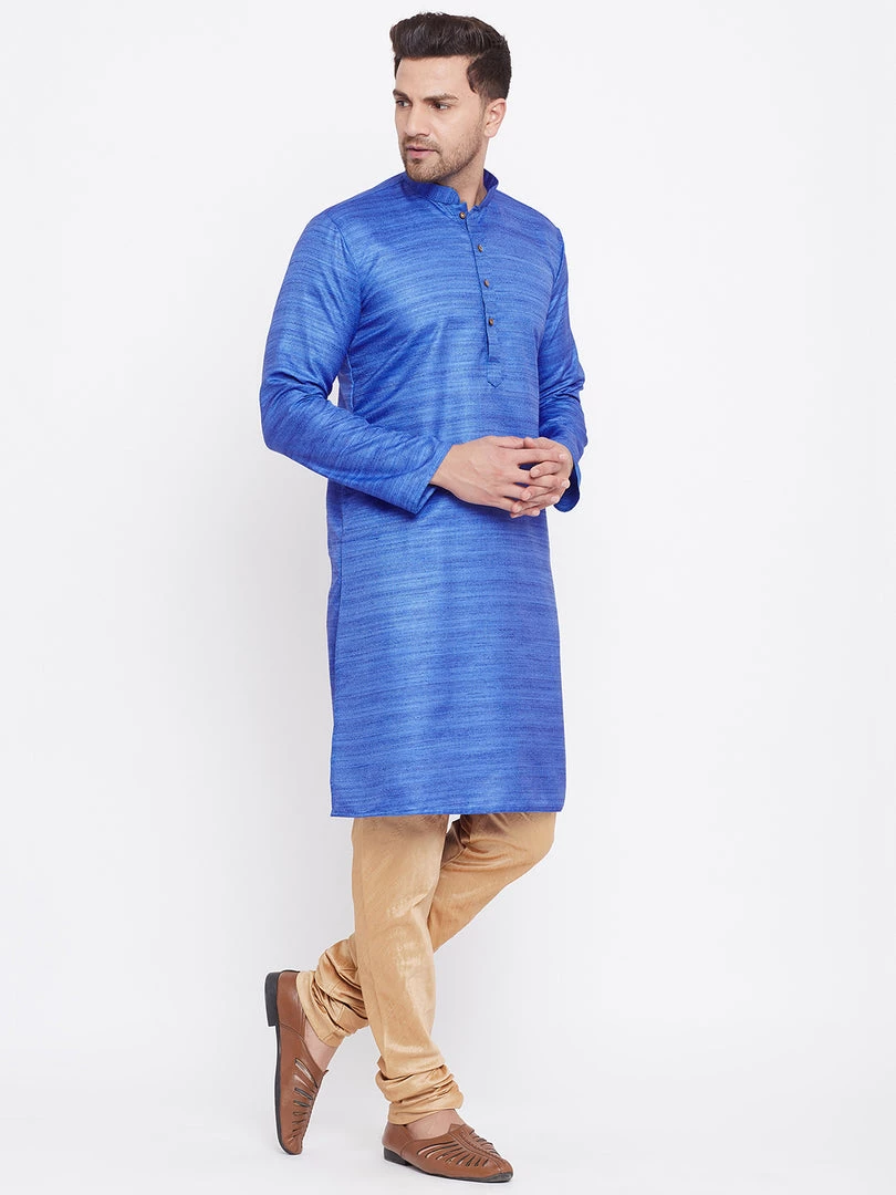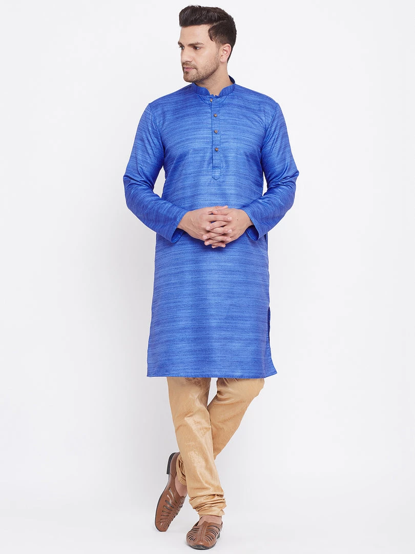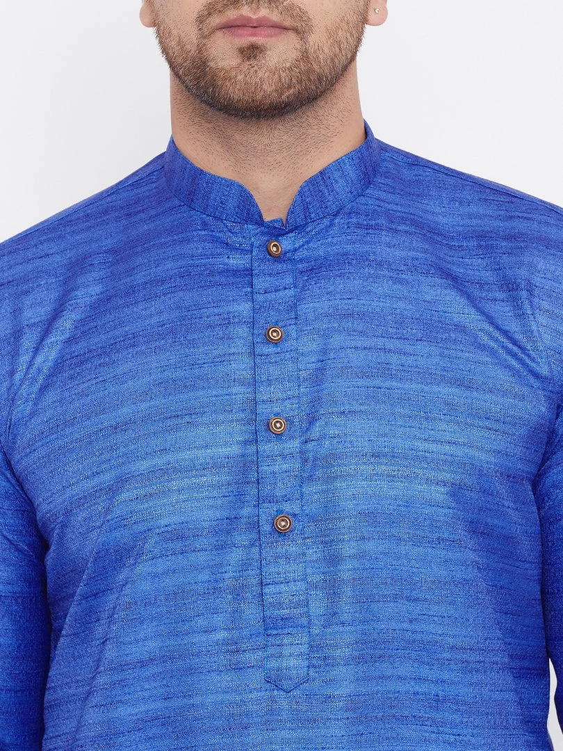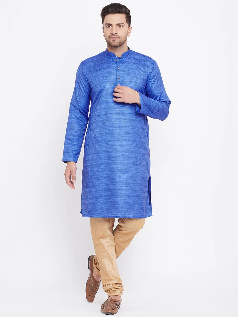 Blue silk blend straight knee length kurta, has a mandarin collar, long sleeves, button placket, straight hem.