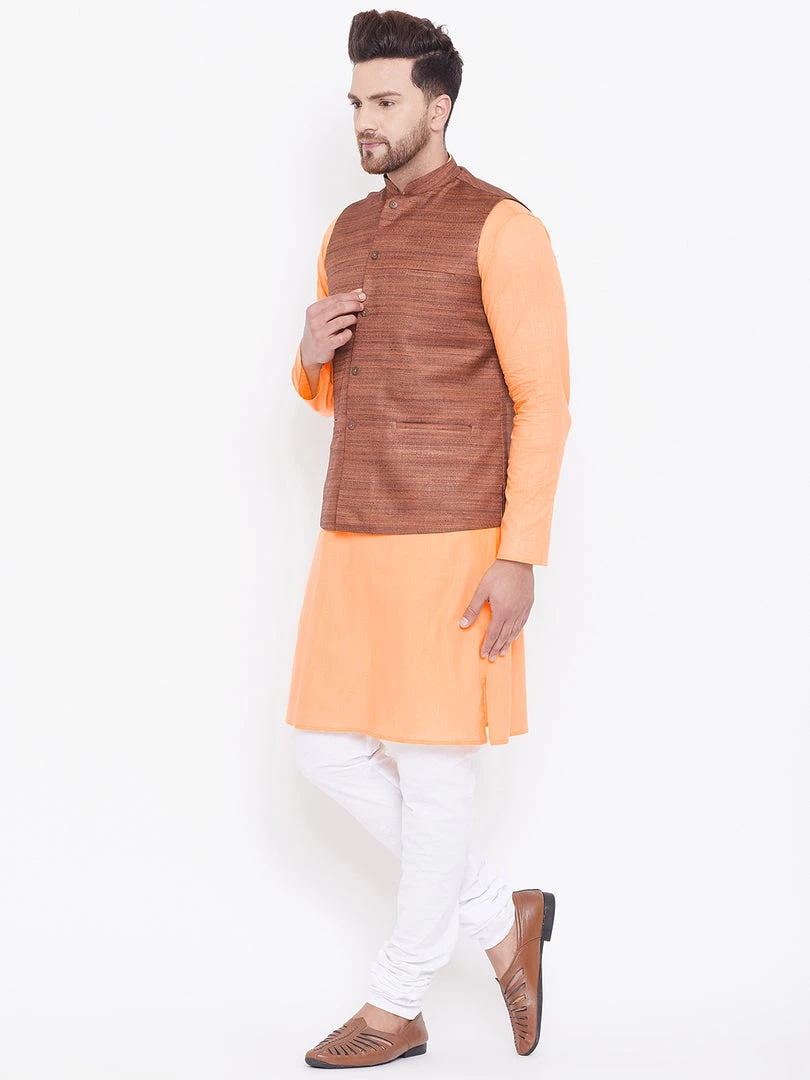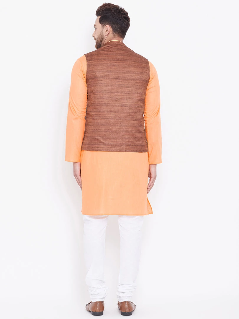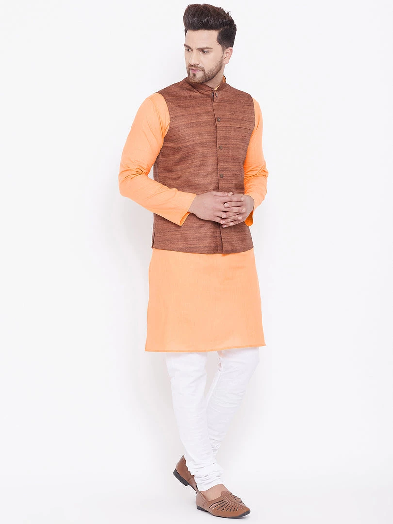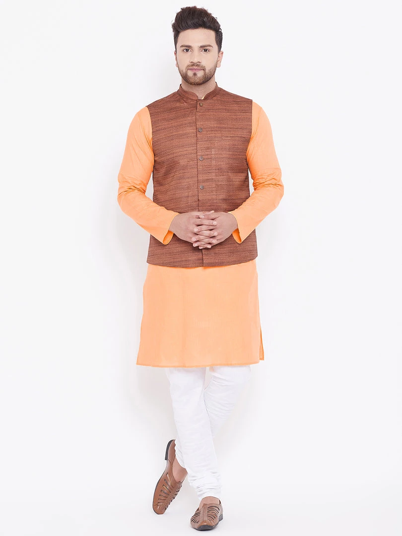 Fawn solid kurta with solid churidar and coffee brown Nehru jacket