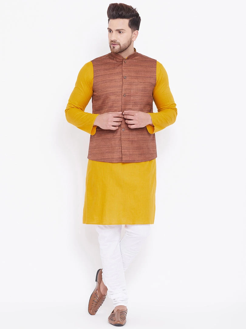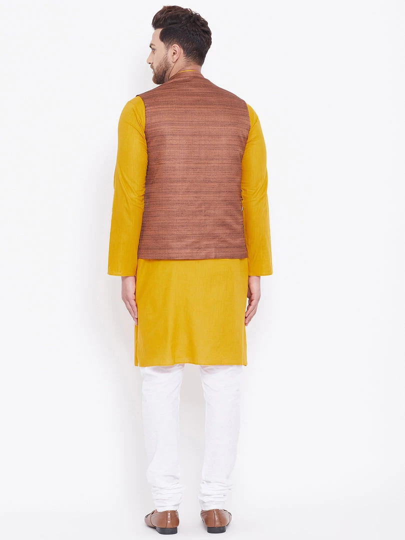 Mustard solid kurta with solid churidar and coffee brown Nehru jacket