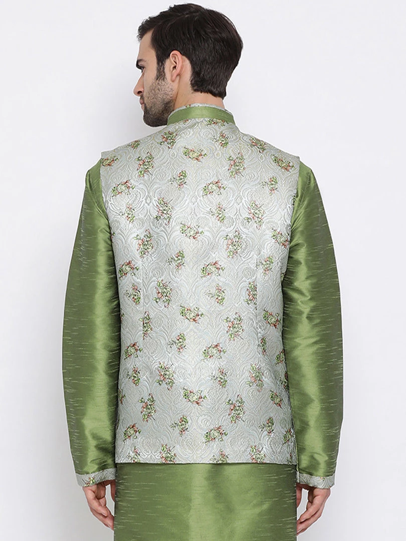 Grey woven floral printed Nehru jacket, has a mandarin collar, a full button placket, sleeveless, a welt pocket. Comes with pocket square.