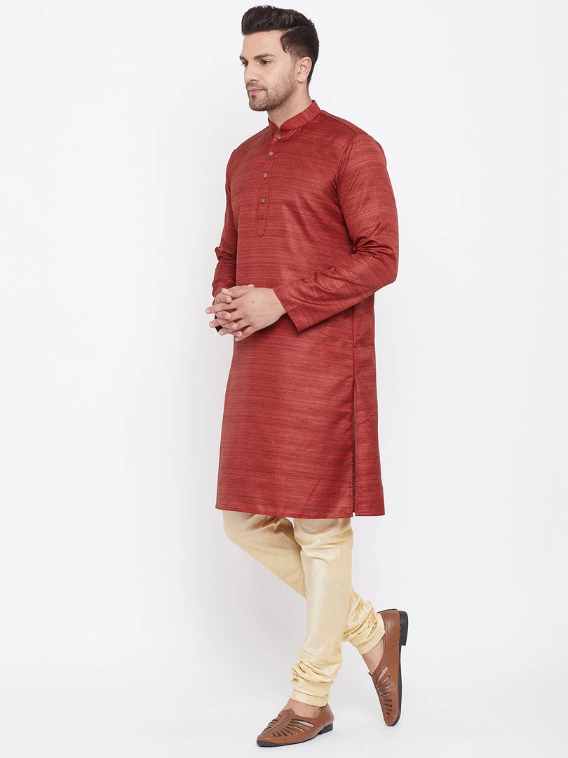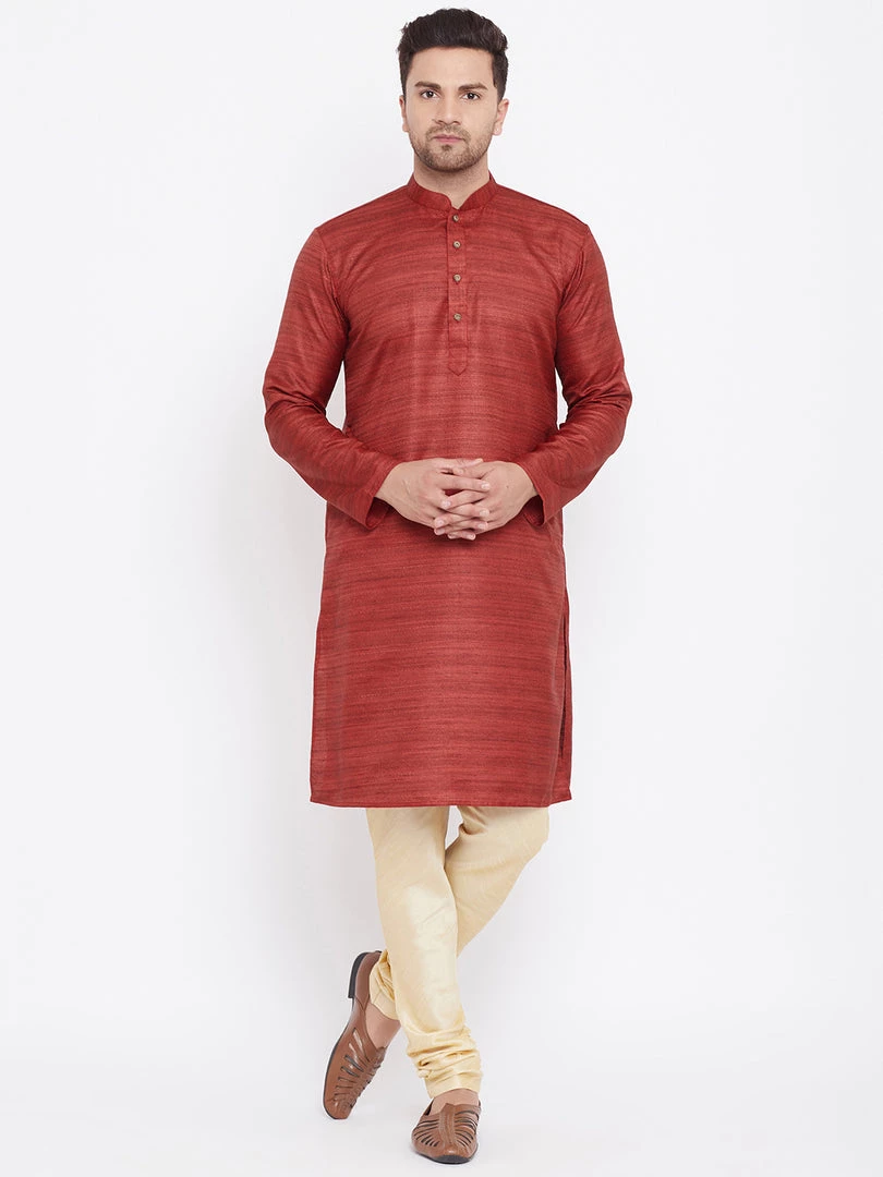 Maroon silk blend straight knee length kurta, has a mandarin collar, long sleeves, button placket, straight hem.