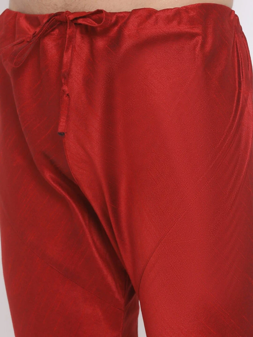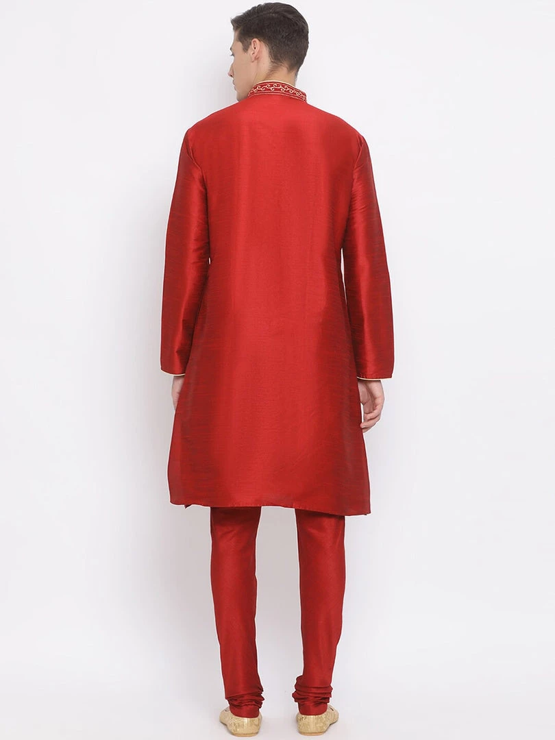 Maroon solid straight knee length kurta, has a mandarin collar, long sleeves, golden detailing around collar and placket, straight hem