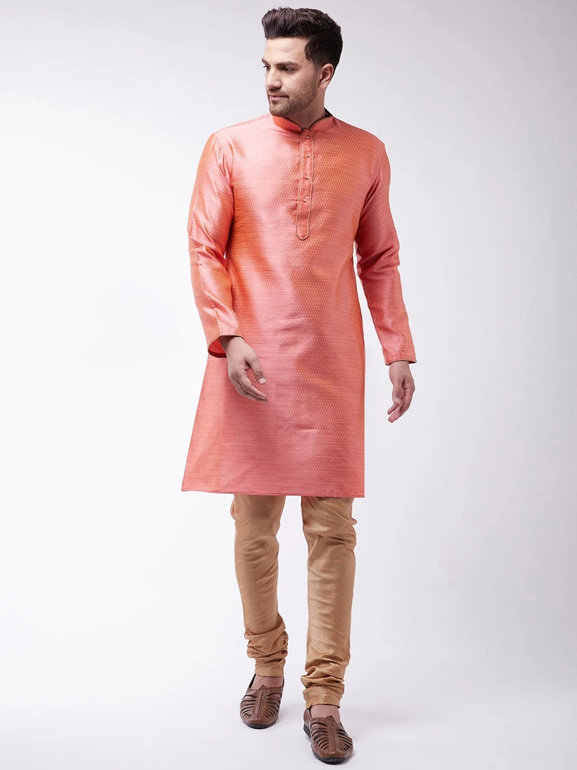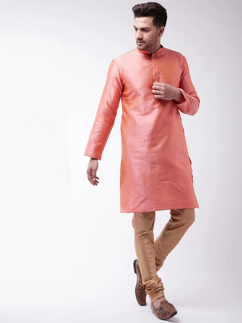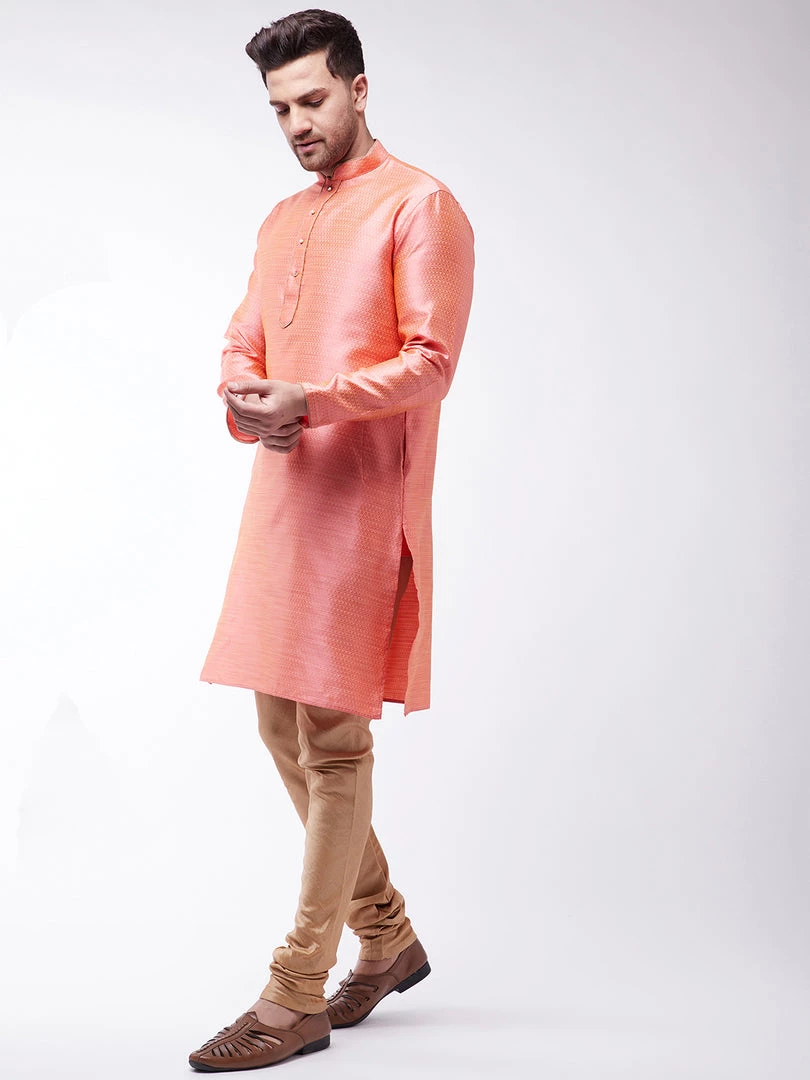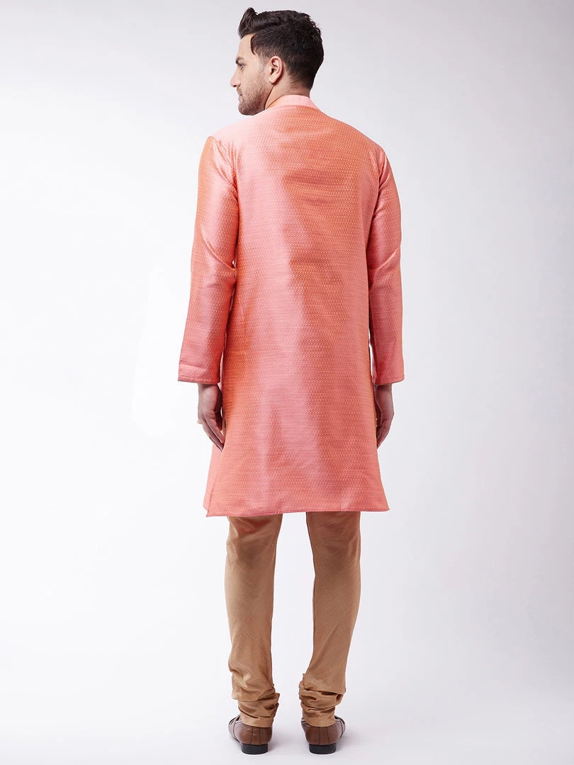 Pink and beige woven design banarasi jacquard straight knee-length kurta, has a mandarin collar, golden piping detailing, button placket, long sleeves, a straight hem, and side slits. Comes with a rose gold churidar, has a drawstring closure.