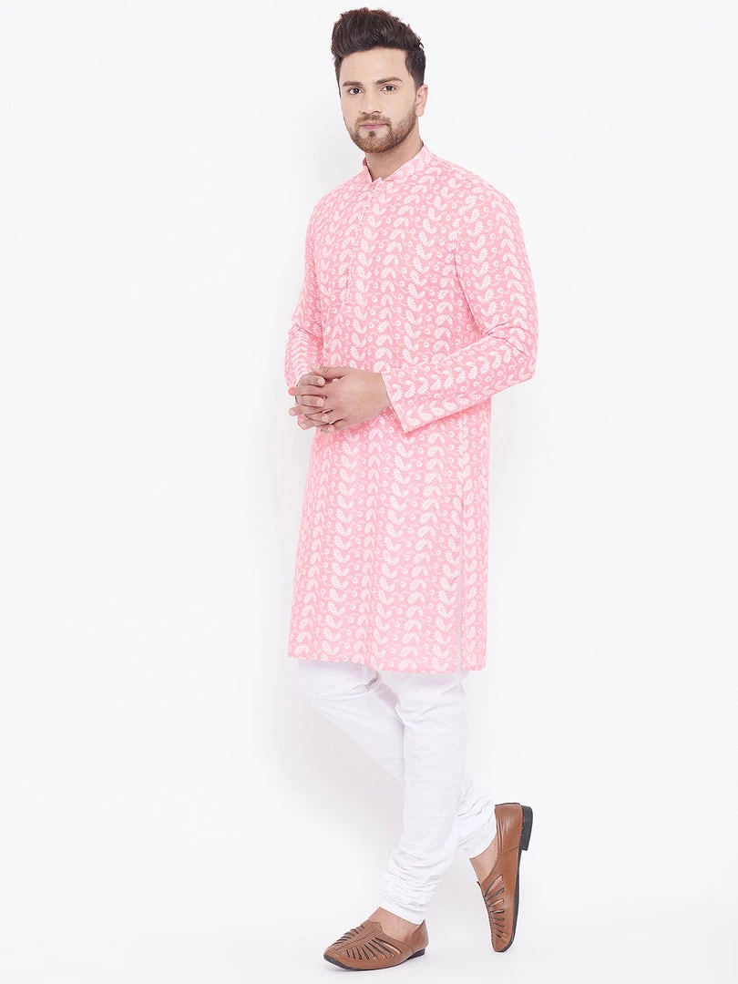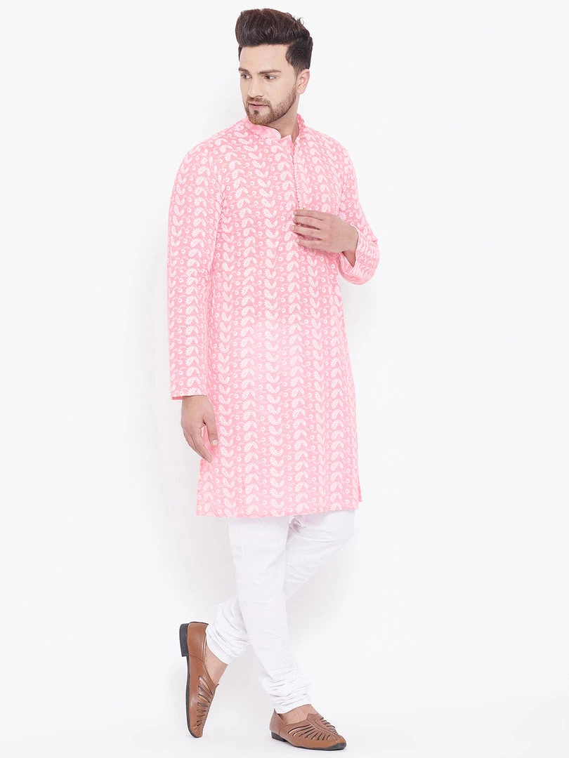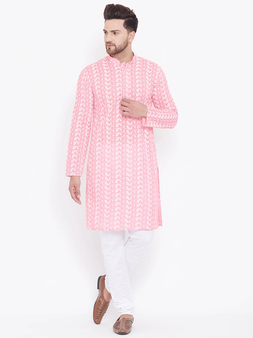 Pink and white chikankari straight knee length kurta, has a mandarin collar, long sleeves, button placket, straight hem.