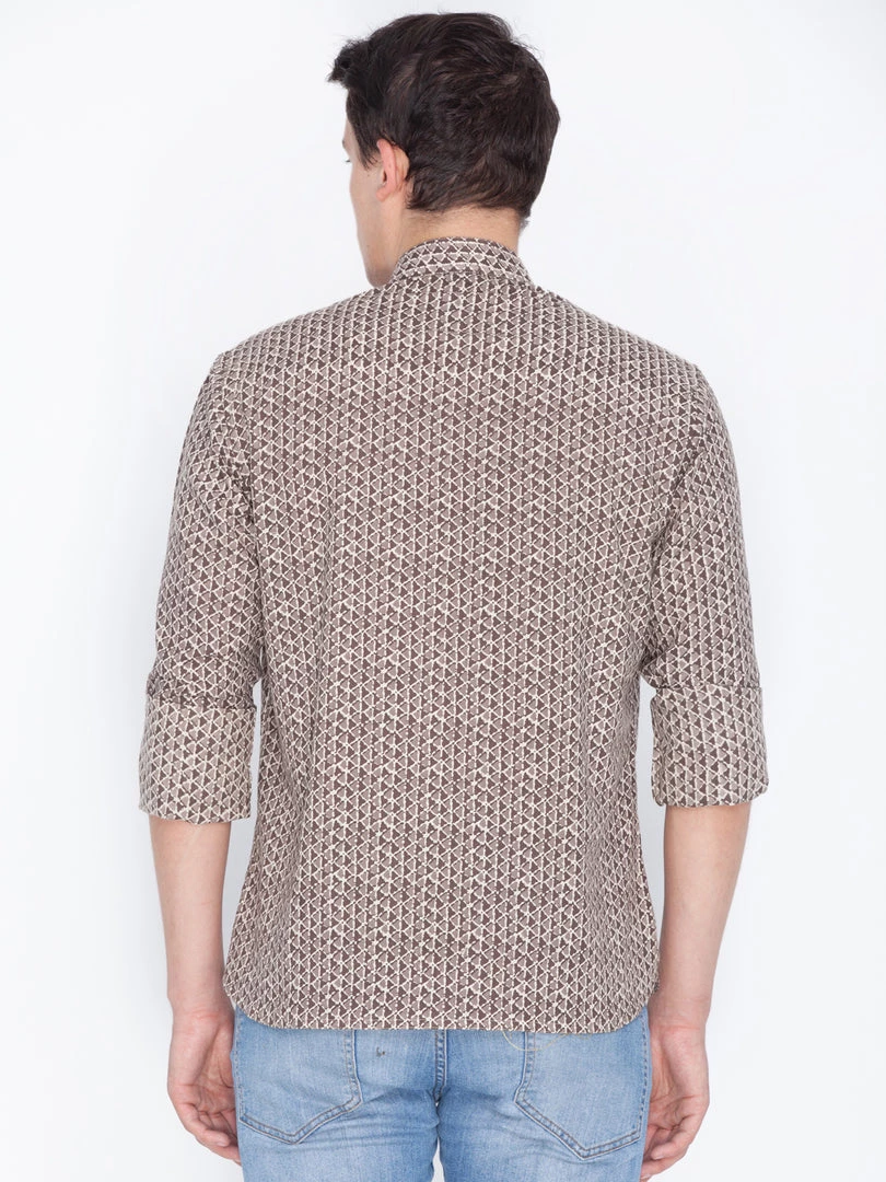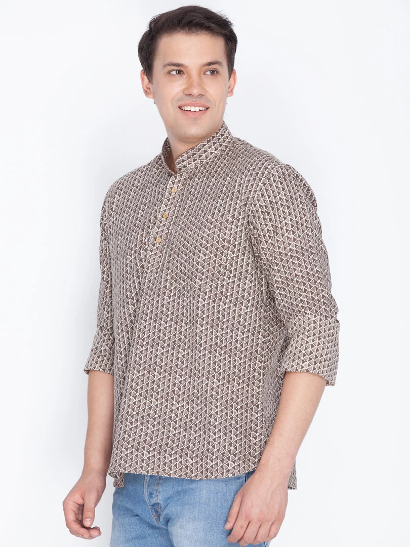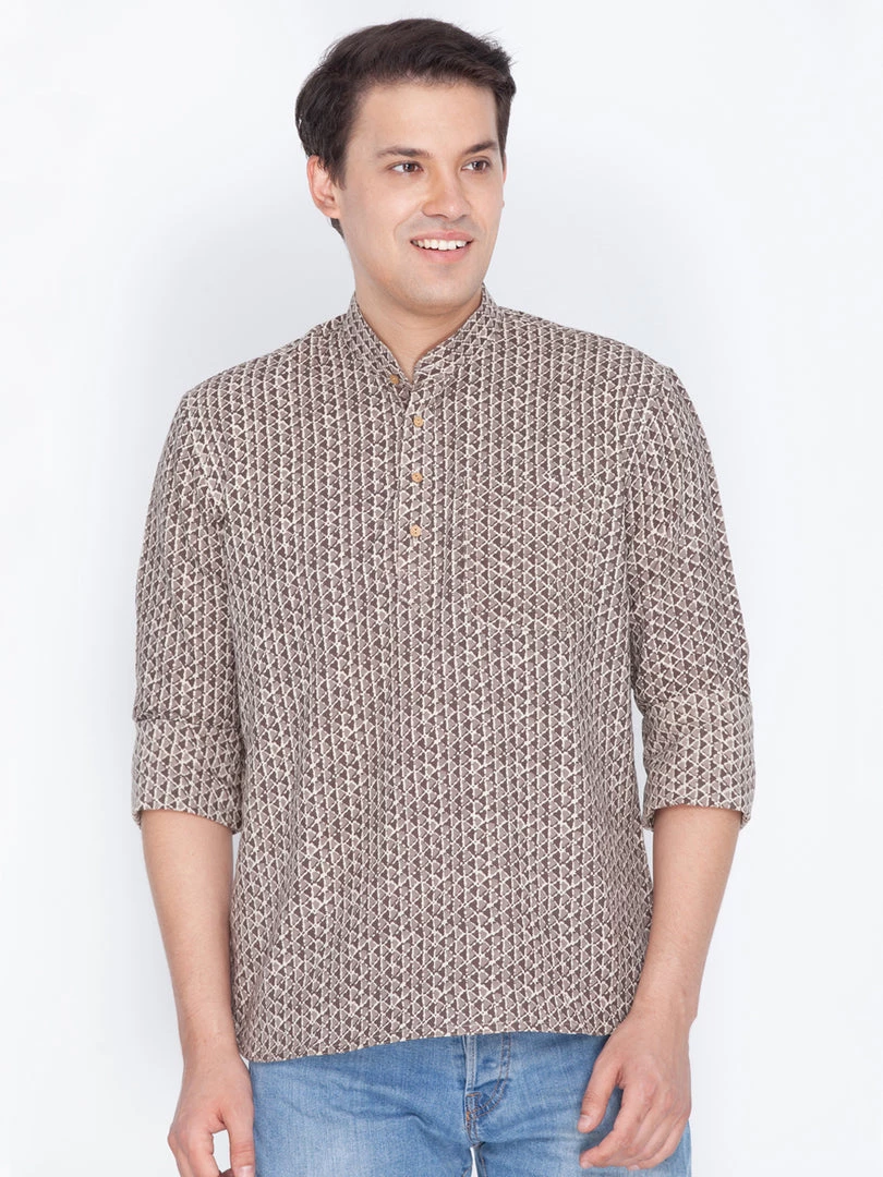 printed cotton kurta has a mandarin collar, a full button placket, sleeveless, above knee with straight hem