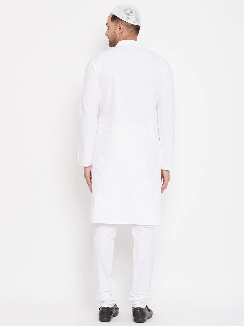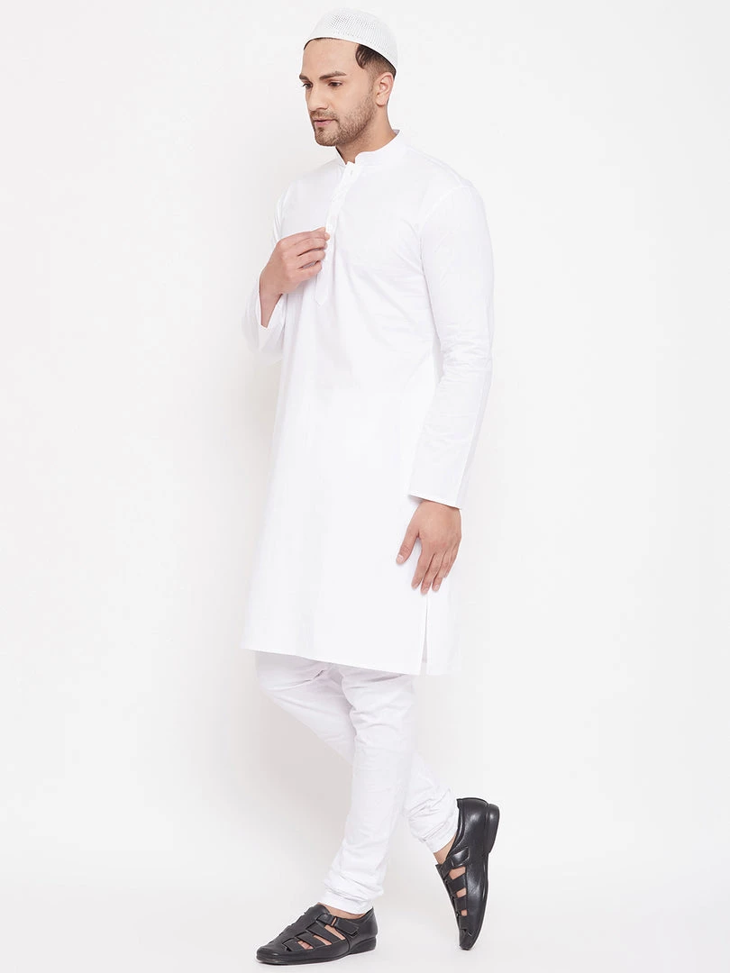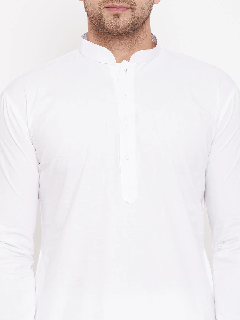 White solid straight knee length kurta, has a mandarin collar, button placket, long sleeves, straight hem