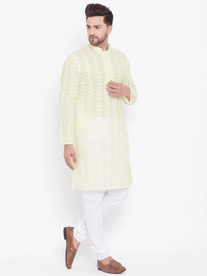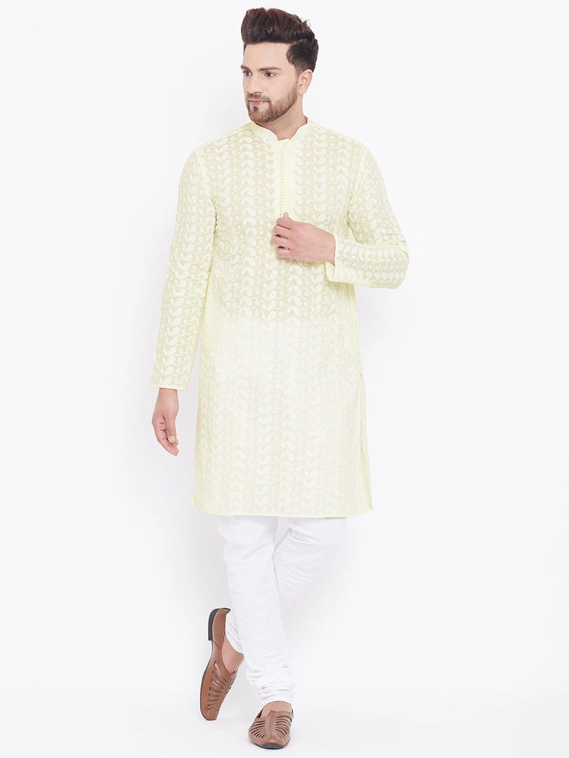 Yellow and white chikankari straight knee length kurta, has a mandarin collar, long sleeves, button placket, straight hem.