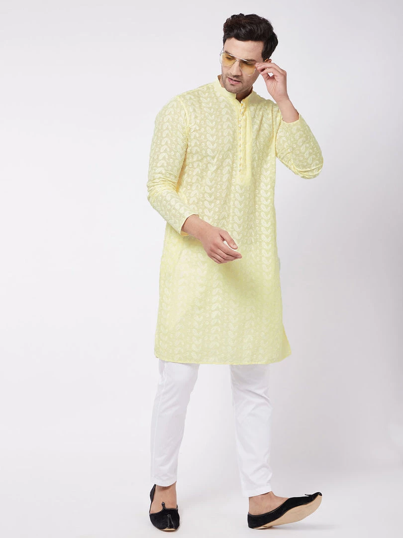 Yellow And White Chikankari Kurta and Pyjama