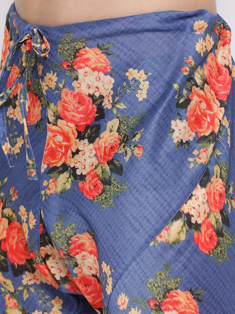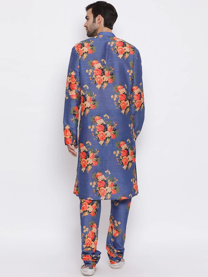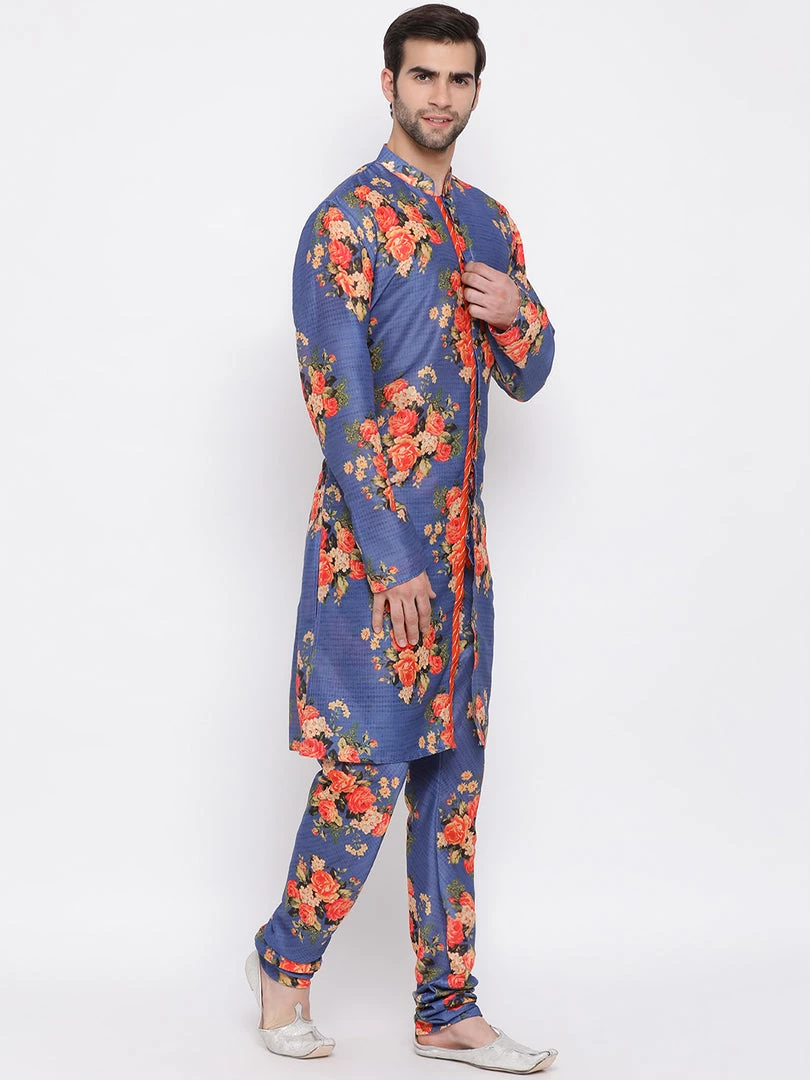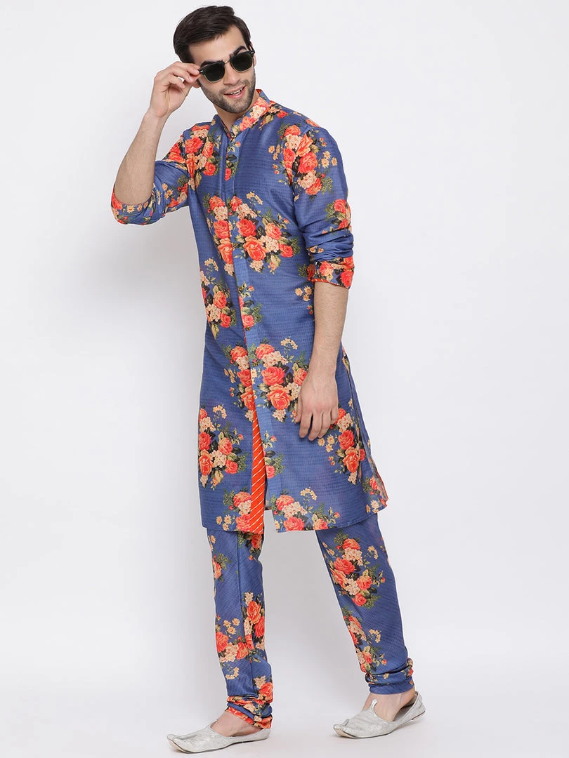 Blue floral printed straight knee length kurta, has a mandarin collar, leharia border, long sleeves, full front button placket, straight hem.