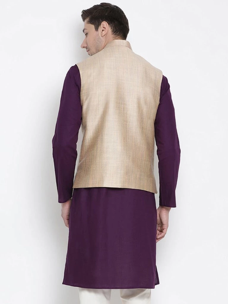 Beige woven Nehru jacket, has a mandarin collar, a full button placket, sleeveless, three pockets