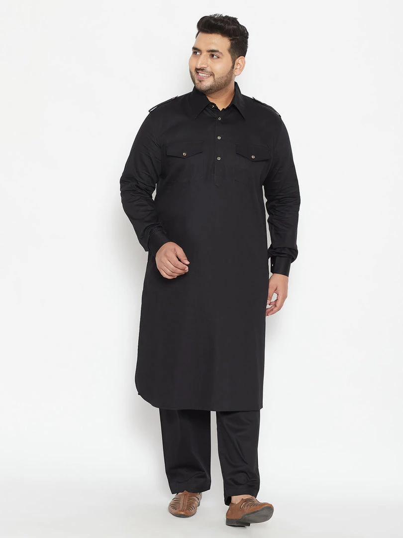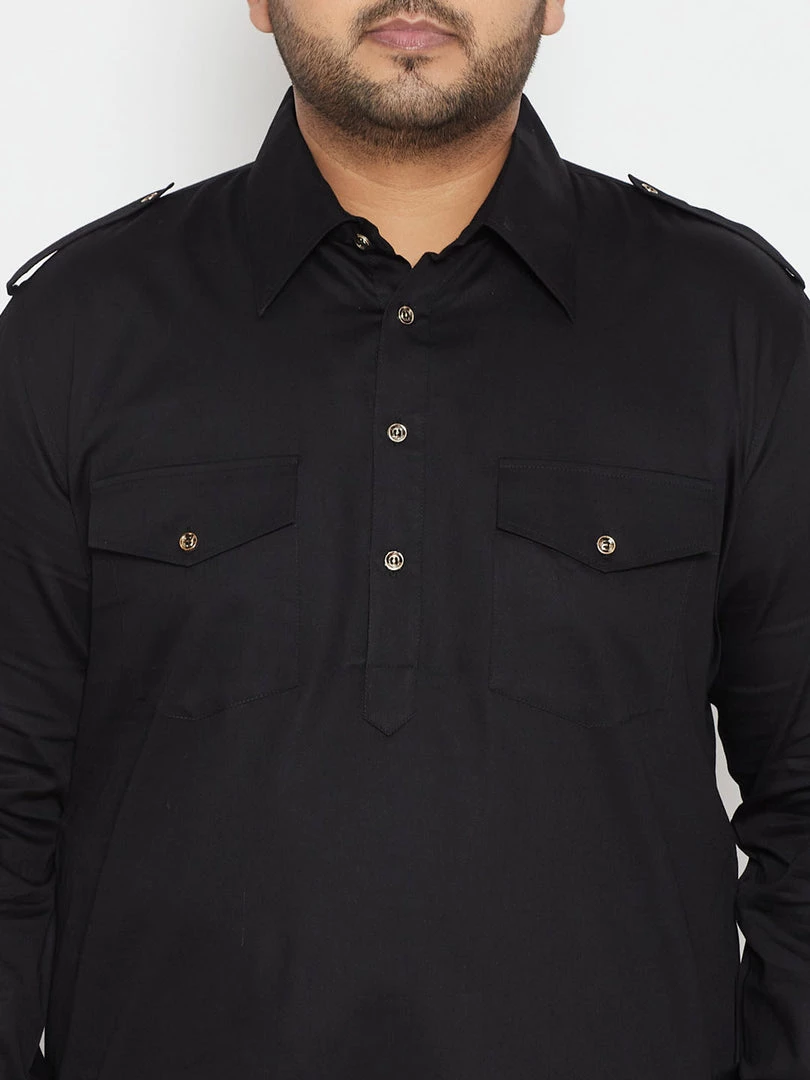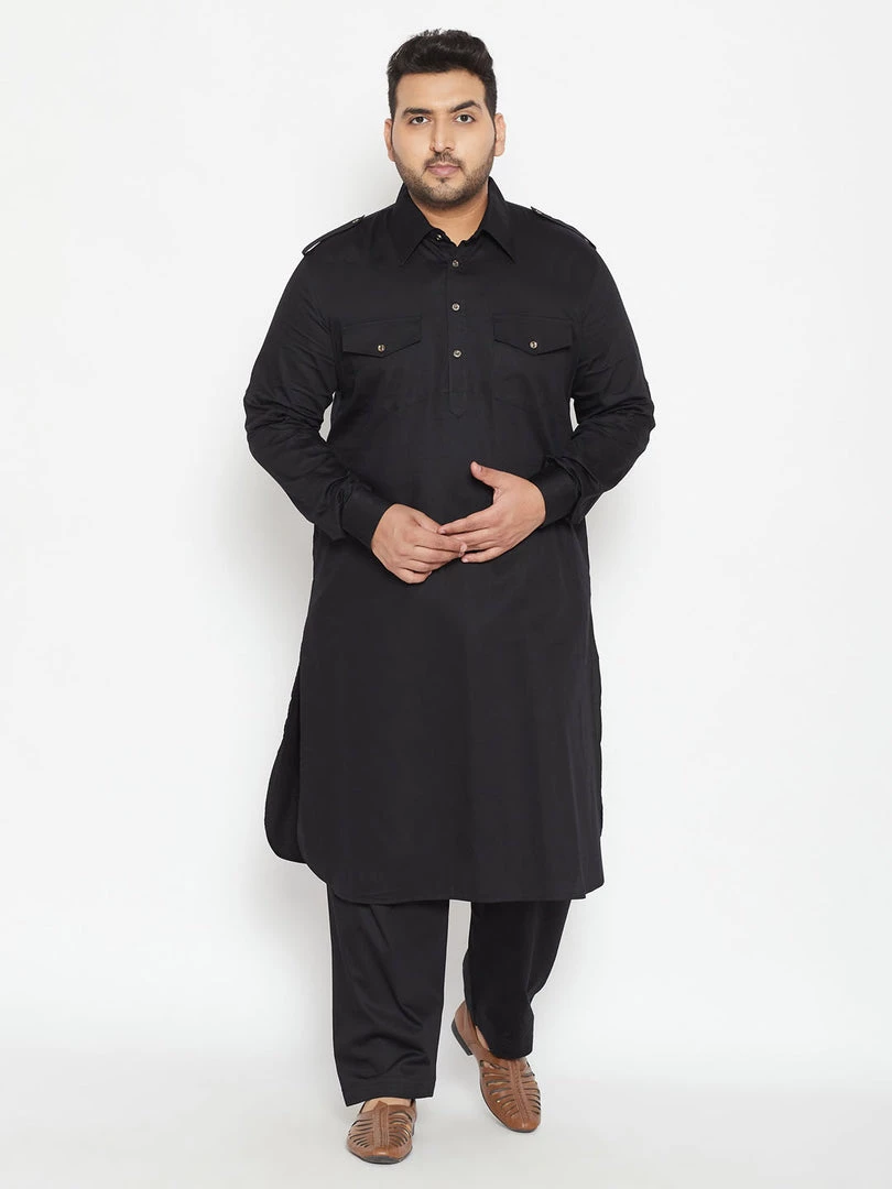 Black solid knee length pathani straight kurta, has a shirt collar, long sleeves with cuff, button placket, two patch pockets, curved hem, side slits.