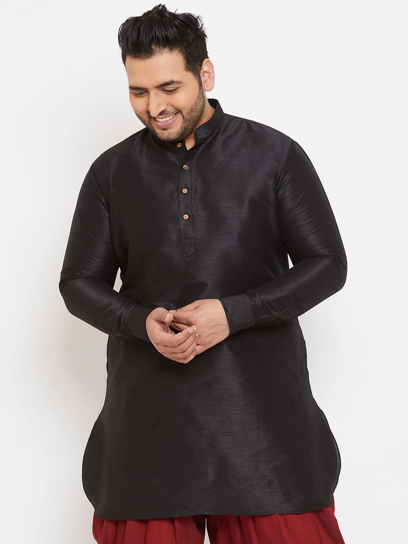 Black straight above knee length kurta, has a mandarin collar, long sleeves with cuffs, button placket, curved hem, and side slits