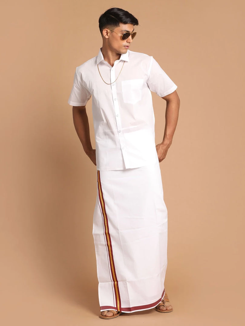 Vastramay brings to you this stylish South Indian style ethnic shirt and ready-to-wear mundu vesty style dhoti pant set for. These are perfect shirt for any occasion including Festivals, ceremonies, Weddings, and Birthday parties. Popularly worn in South India on Vesty Mundu Dhoti along with an Angavastram.