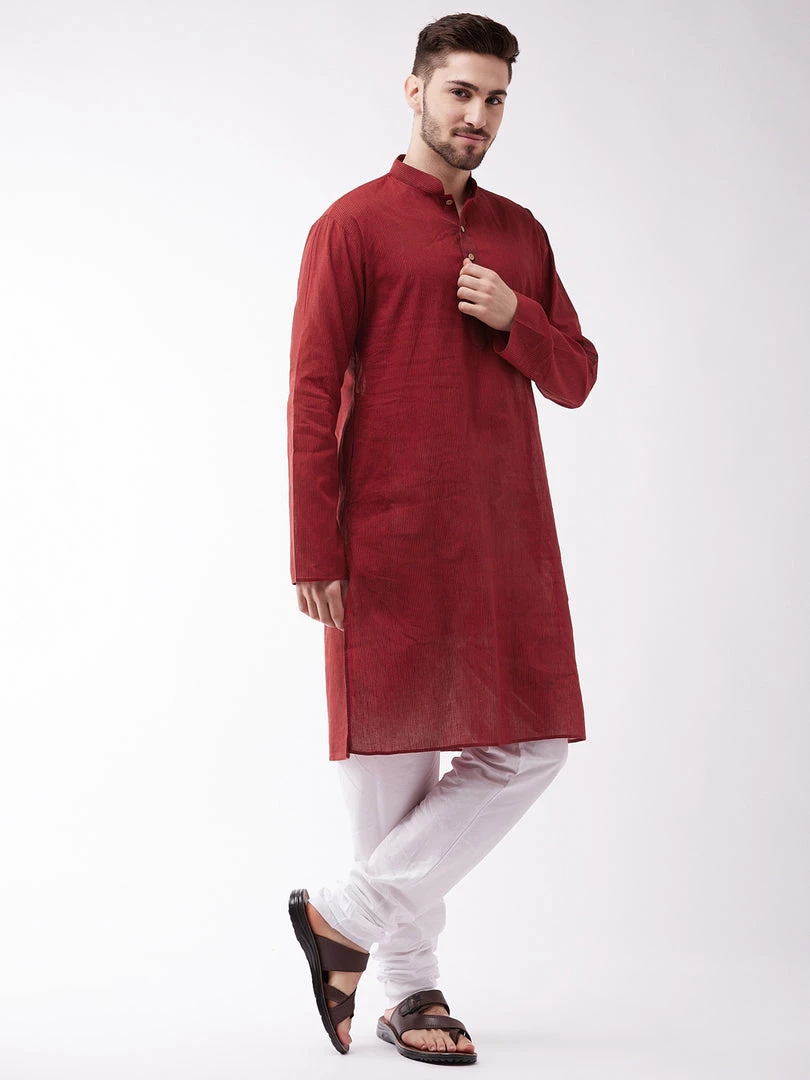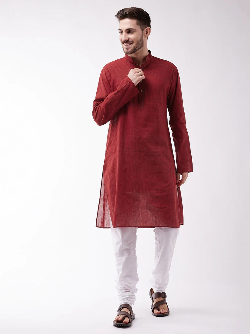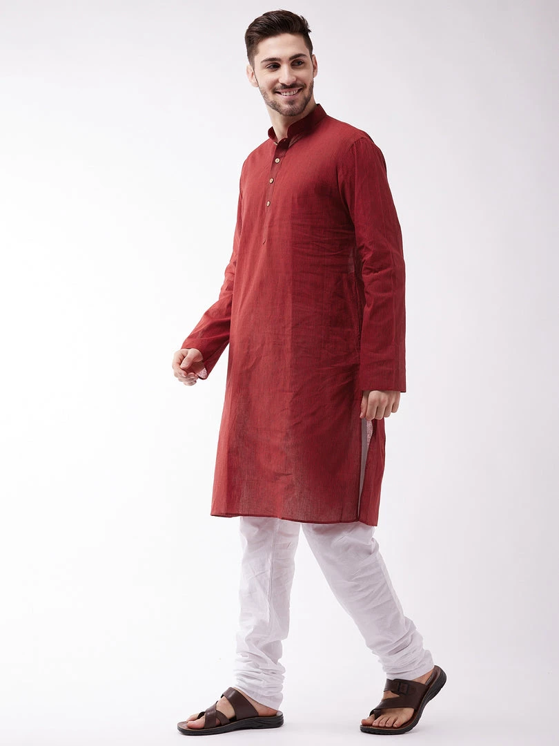 Color: Maroon striped kurta and white cotton pyjama with Mandarin collar and Long, regular sleeves. Has straight shape with regular style. knee length with a straight hem. Pure Handloom cotton.