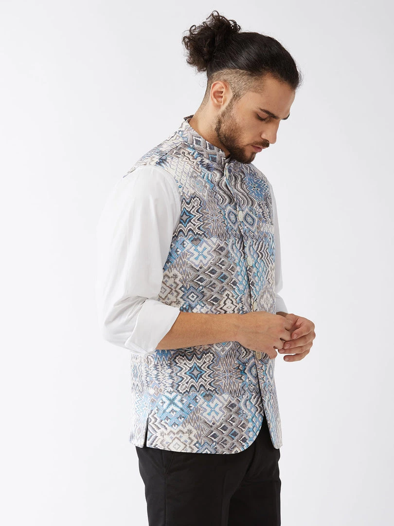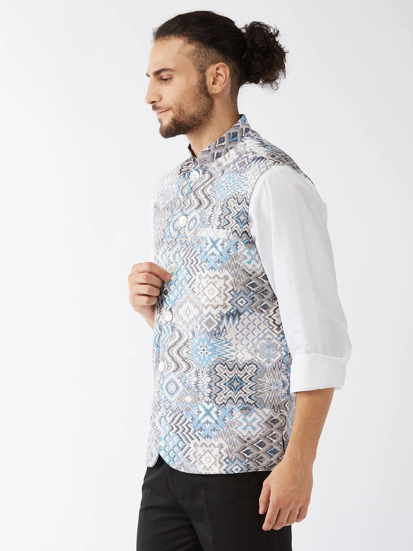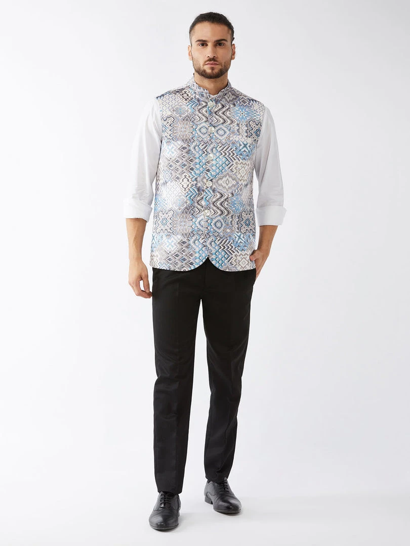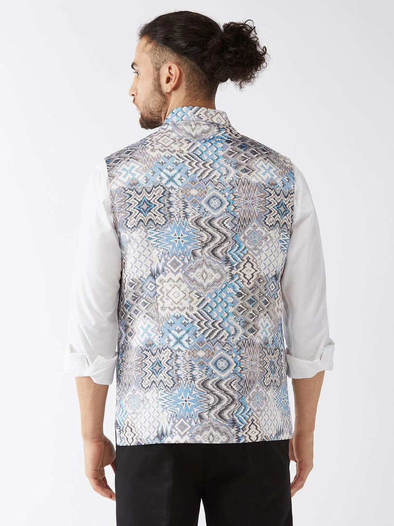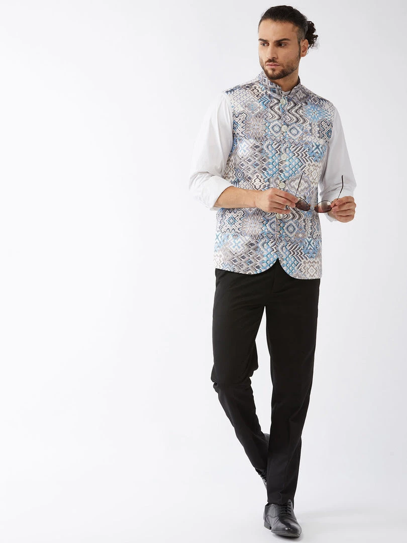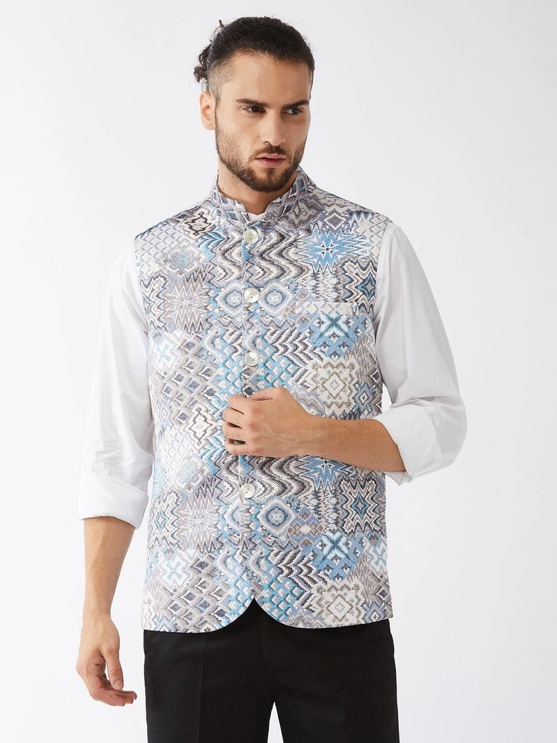 White and blue printed slim-fit satin Nehru jacket, has a mandarin collar, a full designer button placket, sleeveless, three pockets, and an attached lining