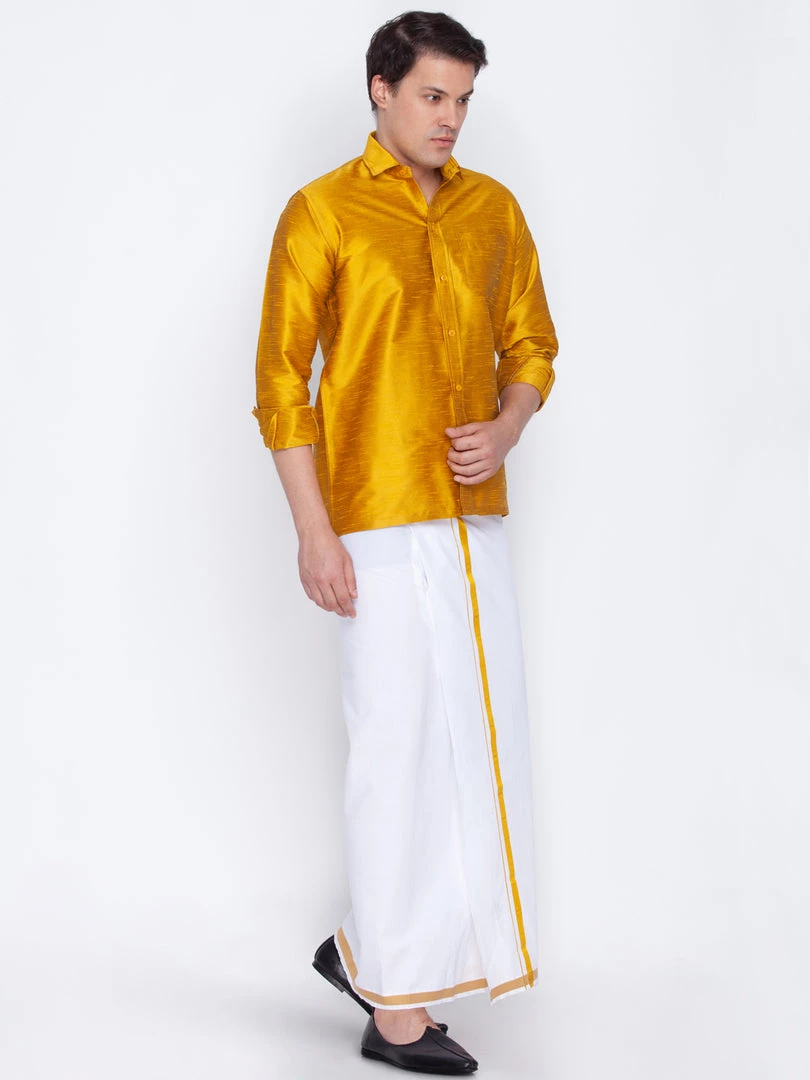White solid mundu, has a wrap-around with Velcro closure, and a contrast gold-colored border lining